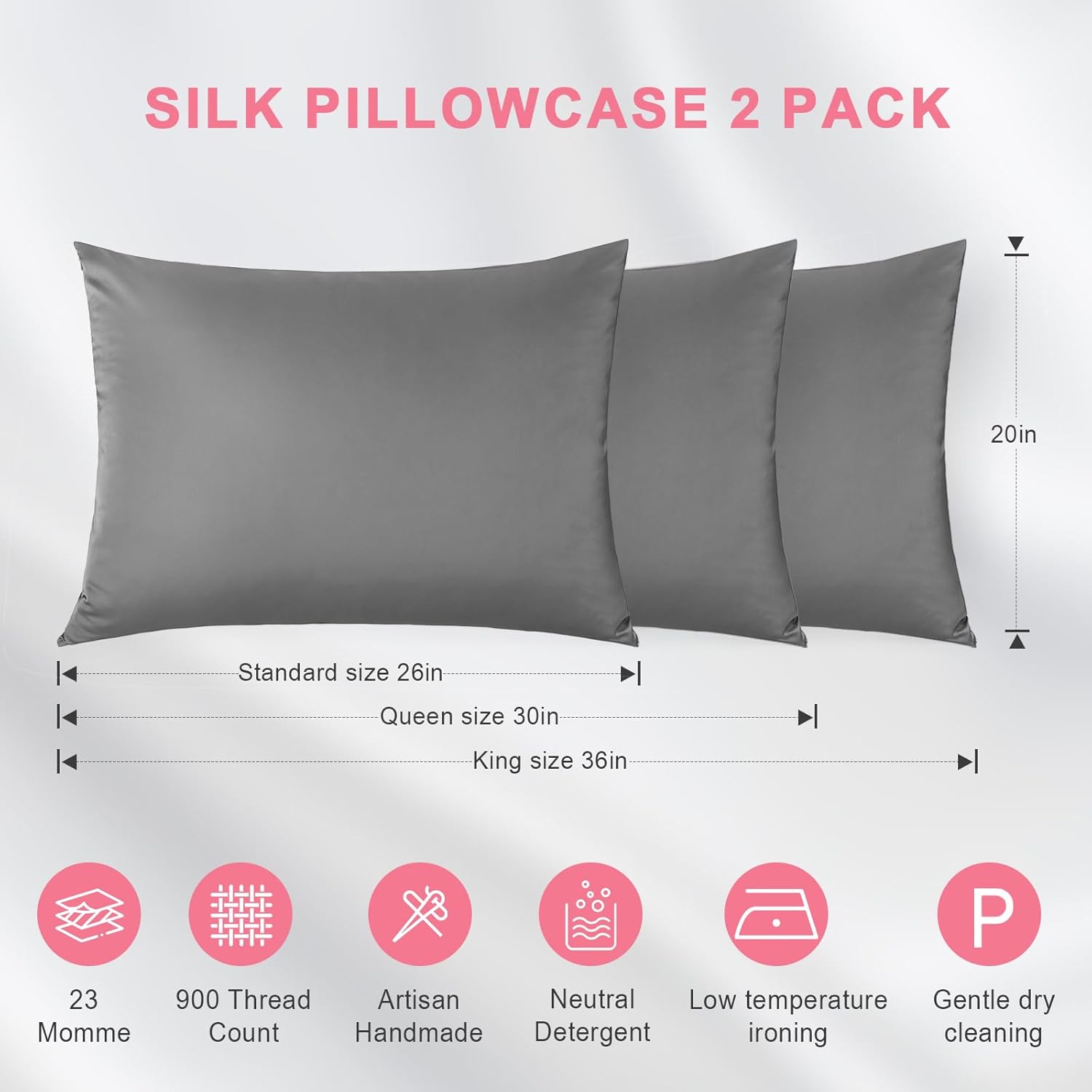 100% Silk Pillowcase 2 Pack for Hair and Skin, Both Sides 23 Momme Grade 6A+ Mulberry Silk Pillowcases with Hidden Zipper, Soft&Smooth Cooling Pillow Cases (Gray, Standard 20×26)