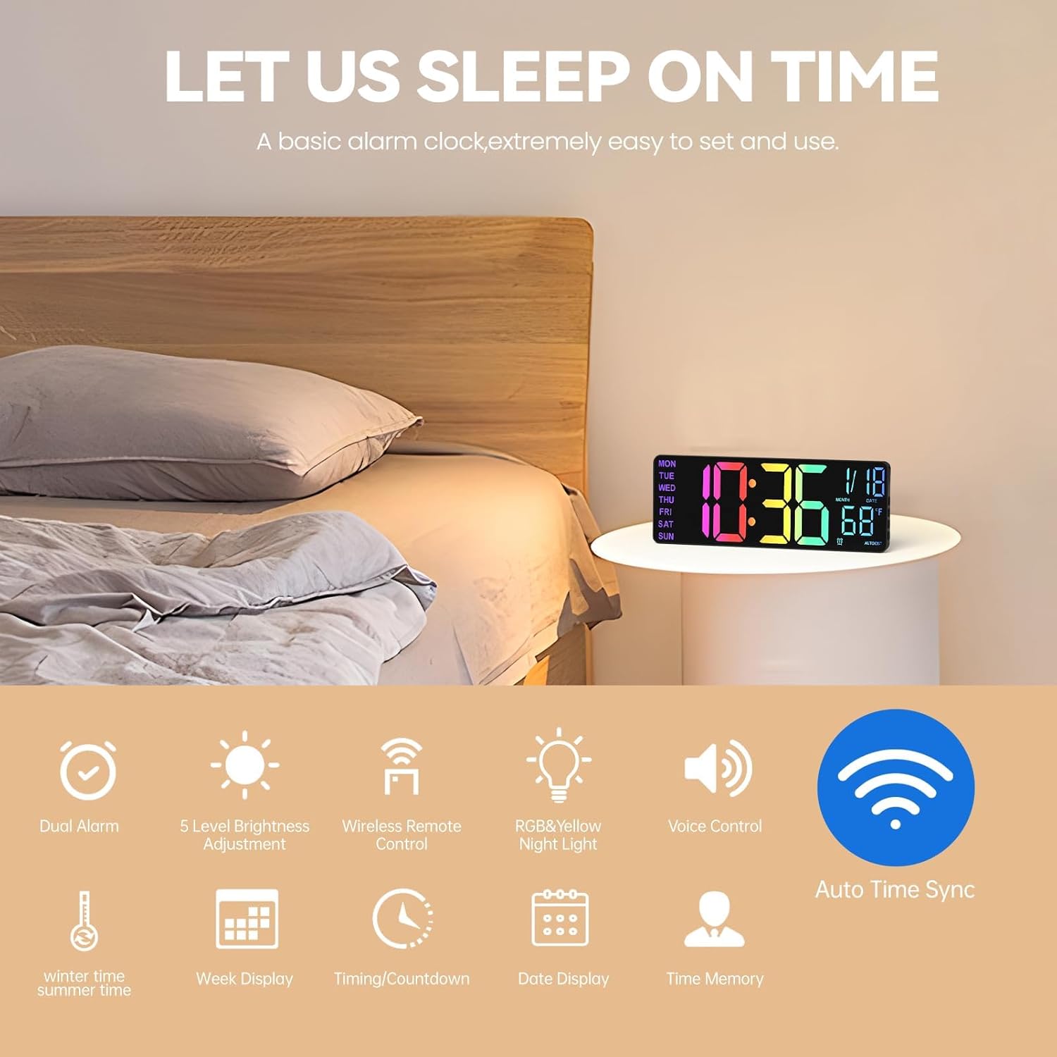 【Auto DST & Auto-Dimming】Spring and fall time changes happen automatically at 2 a.m. while you sleep. A built-in light sensor raises brightness for daylight and lowers it after dark, so the display is always visible but never glows in your face at night.