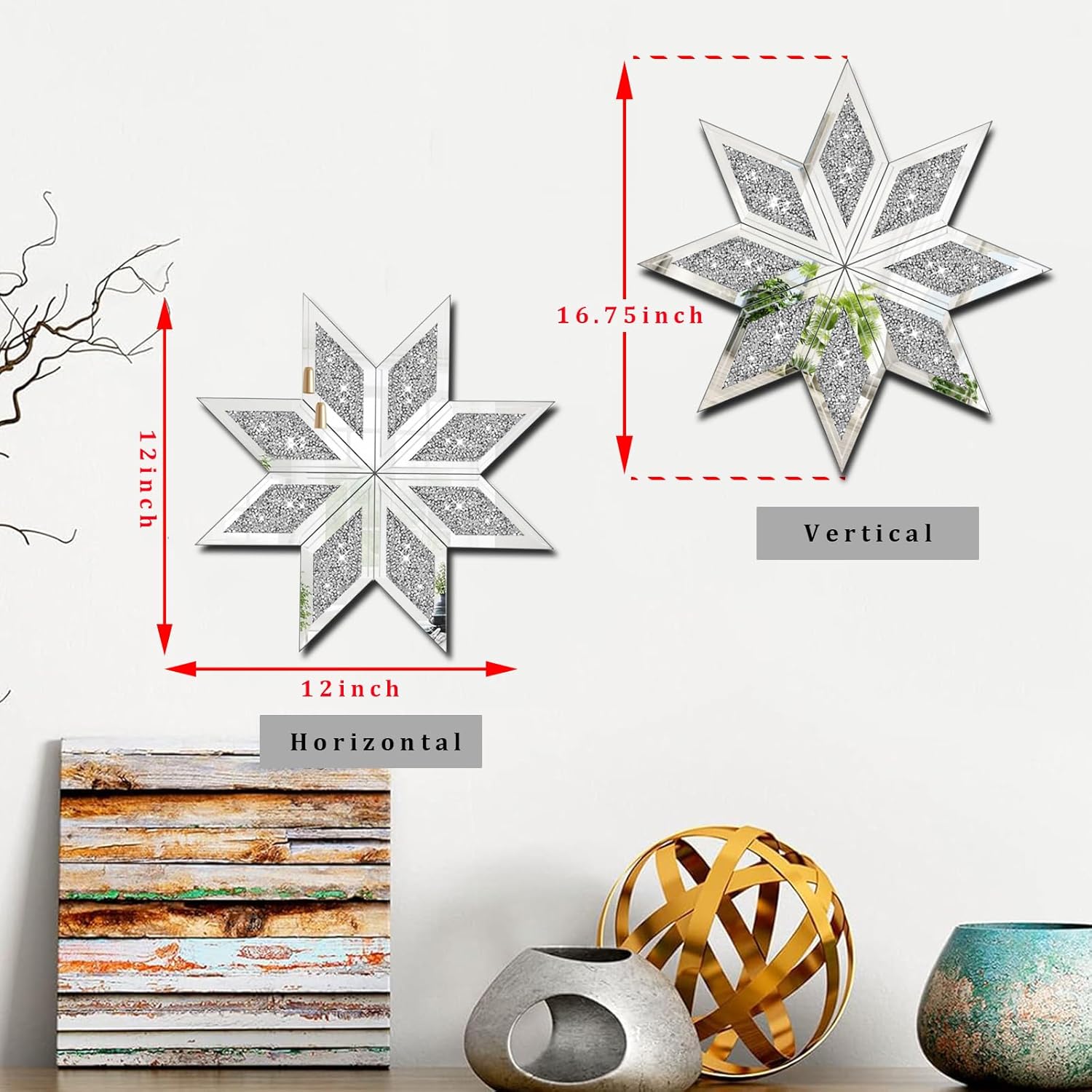 【Glitter Snowflakes Decorations】Sparkling crushed diamond, high quality silver glass mirror and thick and sturdy back, this eye-catching silver wall decor makes your home more fashionable and luxurious and make your space uniquely yours. The wall mirrors for living room is shining in the light, it will help to get a lot of praise.
