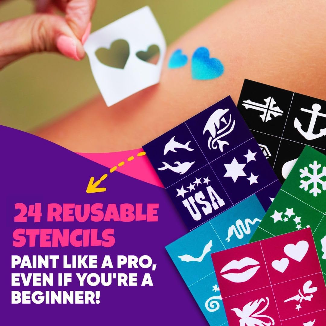 🌈 𝗘𝗔𝗦𝗬 𝗧𝗢 𝗨𝗦𝗘: Enjoy face paint that glides on effortlessly with bold, rainbow-like coverage! Water-activated and quick-drying to reduce smudging. Face paint palette is safe, and ideal for parties, Halloween, or everyday creative fun. Includes stencils and a design book for endless inspiration!