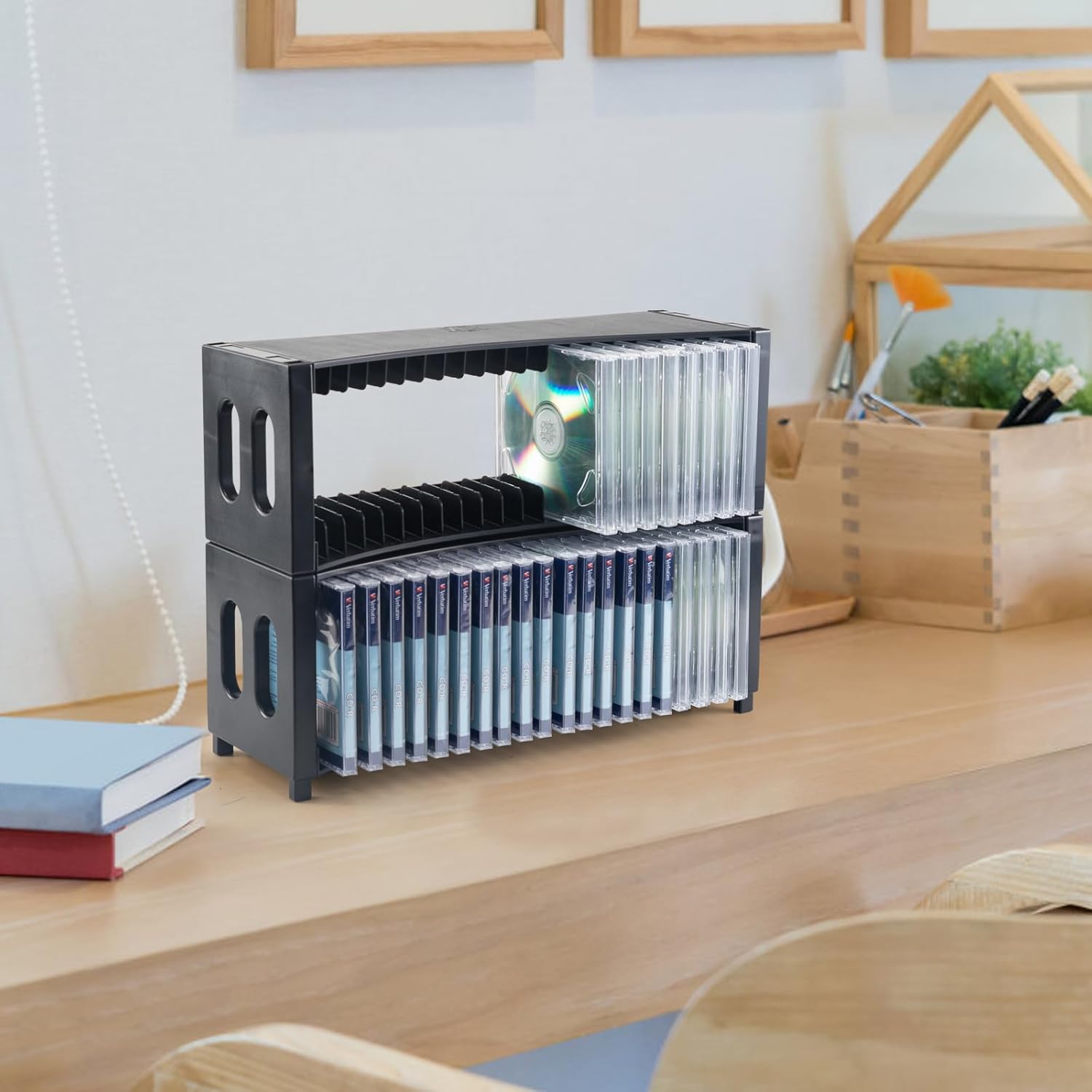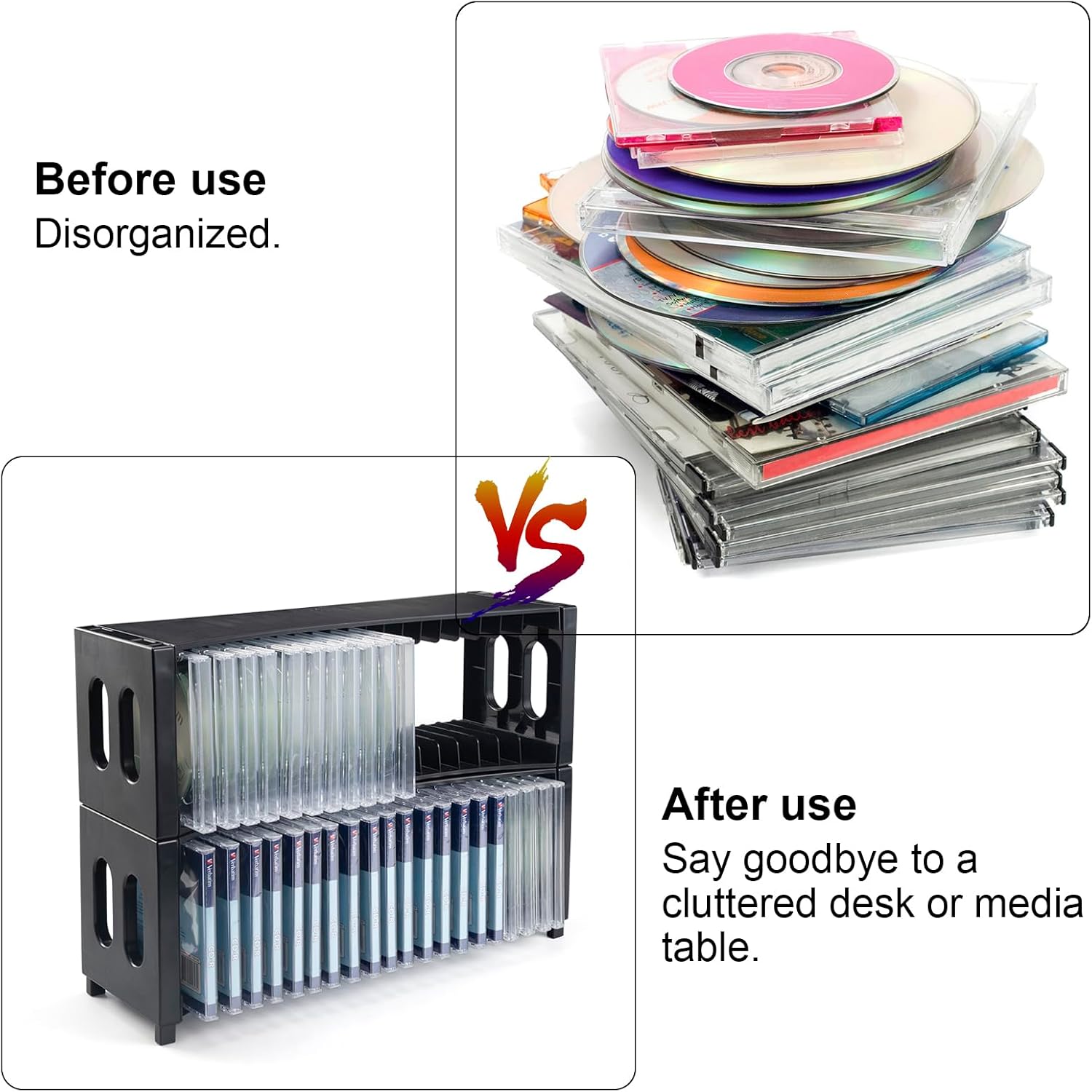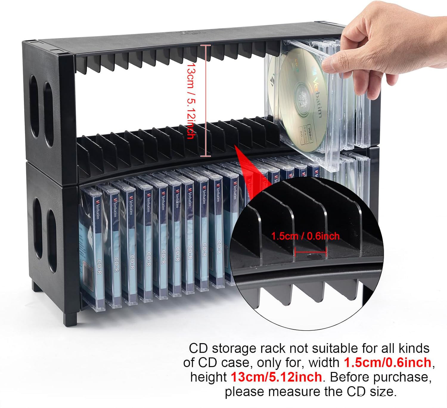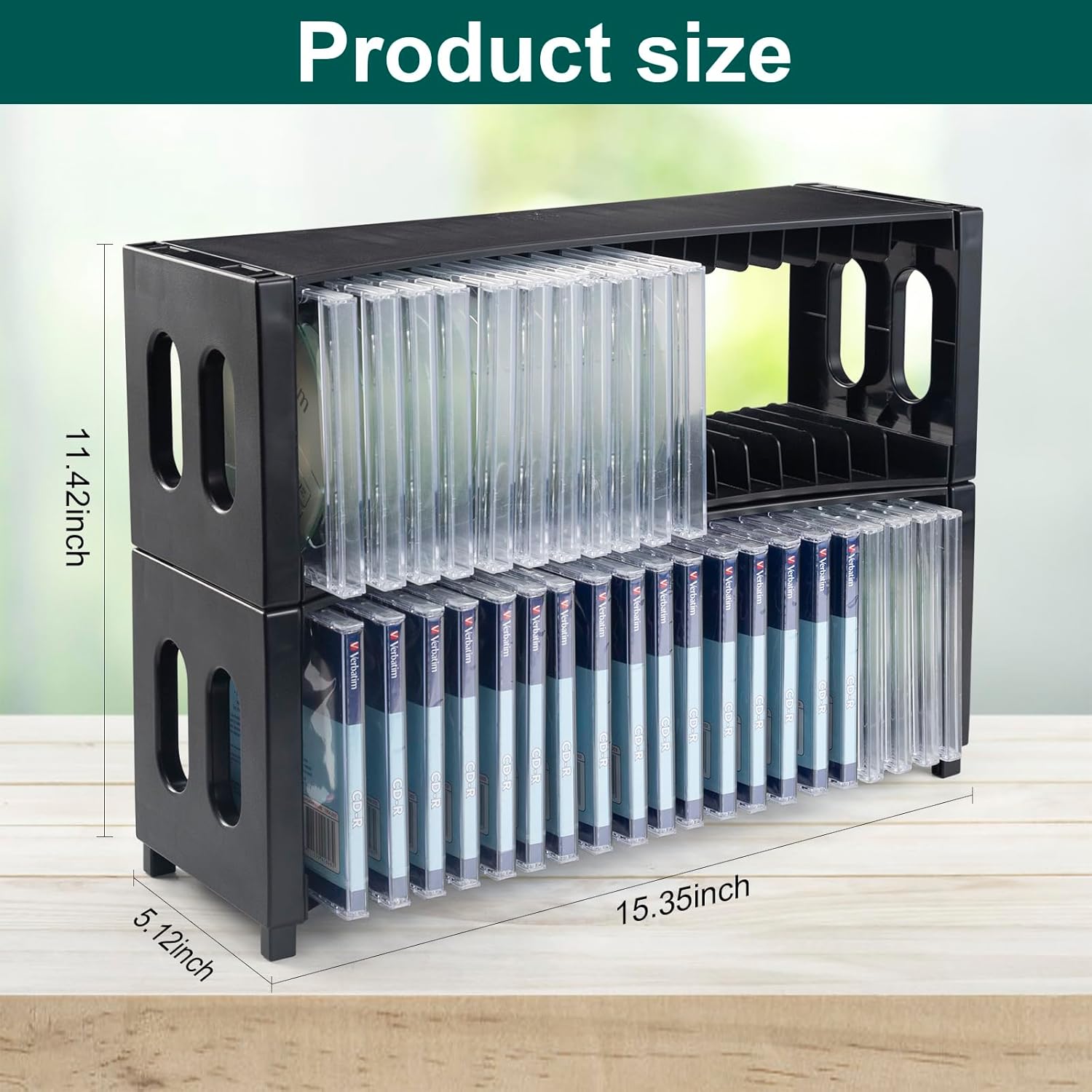 2 Pack CD Organgizer: 2 pack cd organizer stack size is 15.35*5.12*11.42inch. CD storage rack features multiple compartments, providing ample space to hold a large collection of CDs. Each slot is designed to securely hold CDs without the risk of scratches or damage. It can accommodate up to 40 CDs, making it perfect for music enthusiasts who want to keep their entire collection organized and easily accessible.