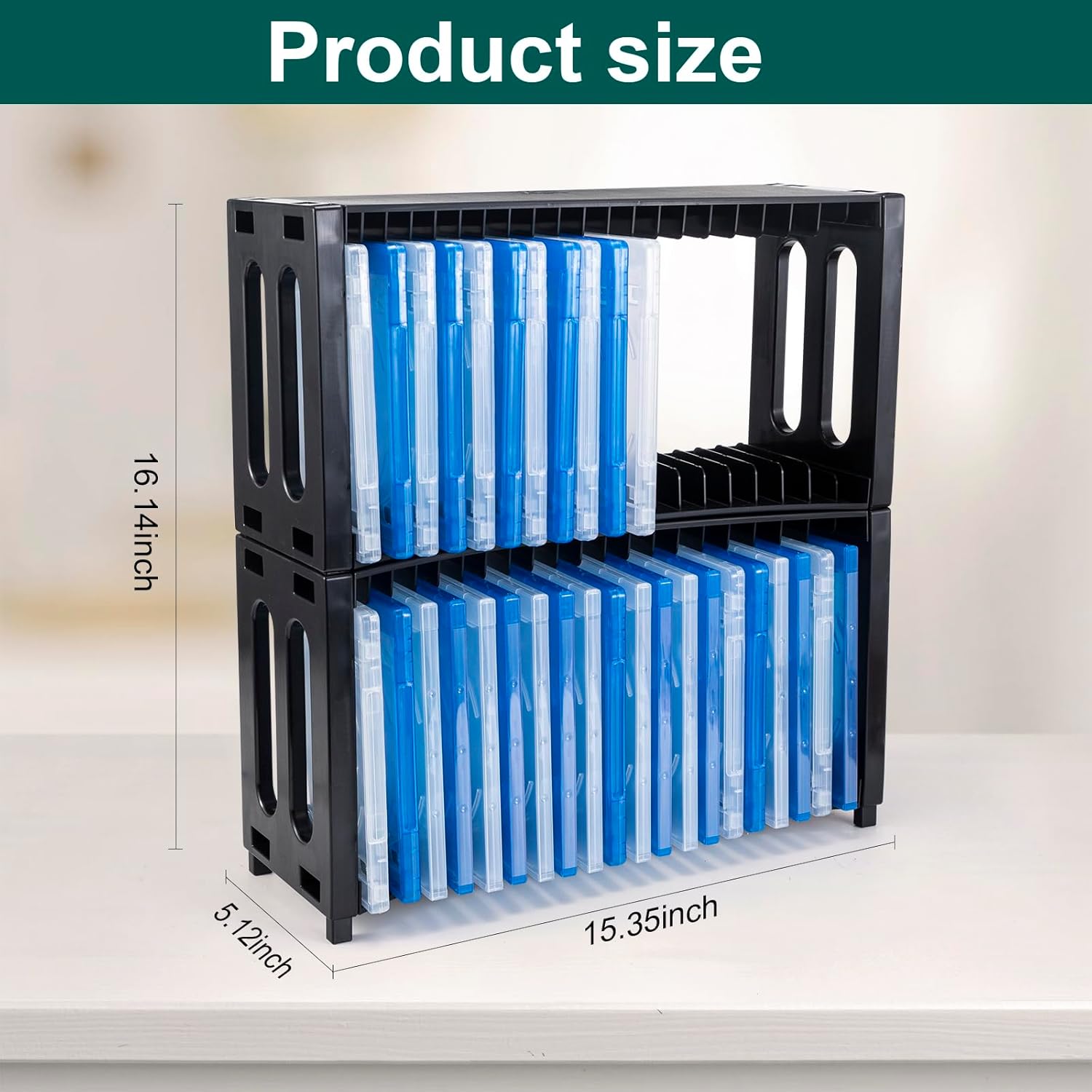 2 Pack DVD Organgizer: 2 pack DVD organizer stack size is 15.35*5.12*16.14inch. The rack offers ample space to accommodate a large collection of CDs, each DVD holder rack can hold 20 slim DVD jewel case, 2 pack DVD rack can store 40 DVD cases. DVD storage can save more space for your shelf, desk, and media room, give you a tidy and neat space.