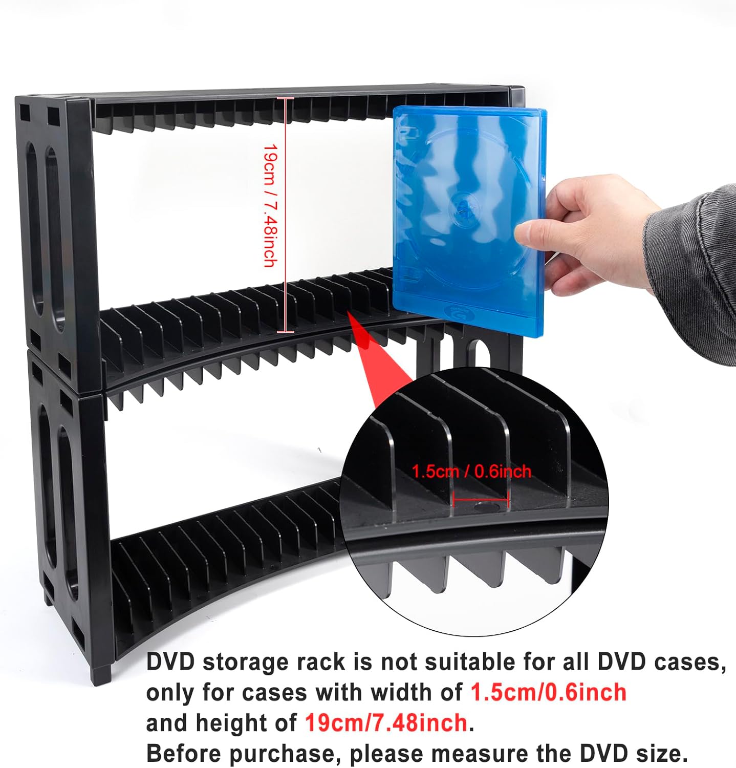 Notice: Please note these organizers are designed to hold standard dvd cases with width of 1.5cm/0.6inch, height of 19cm/7.48inch. And may not apply Blu-Ray or other video game cases, before purchase, please measure the size. If you have any questions about your order, please feel free to contact us. we will reply to you within 24 hours and try our best to solve the problem for you.