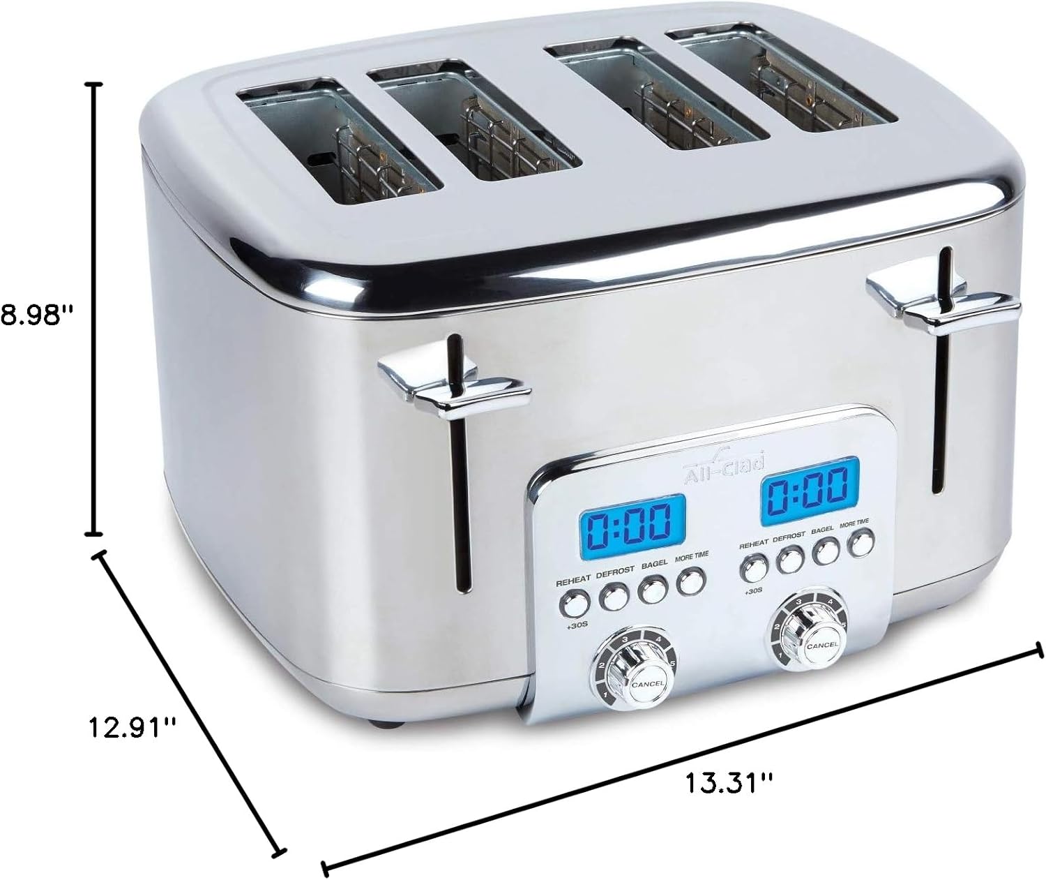 All-Clad Electric Stainless Steel Toaster, 4-Slice, LED Display, Removable Crumb Tray, Internal Cord Storage, 6 Browning Levels, Wide and Self-Centering Slots, Waffles, Bagels, Bread, Silver