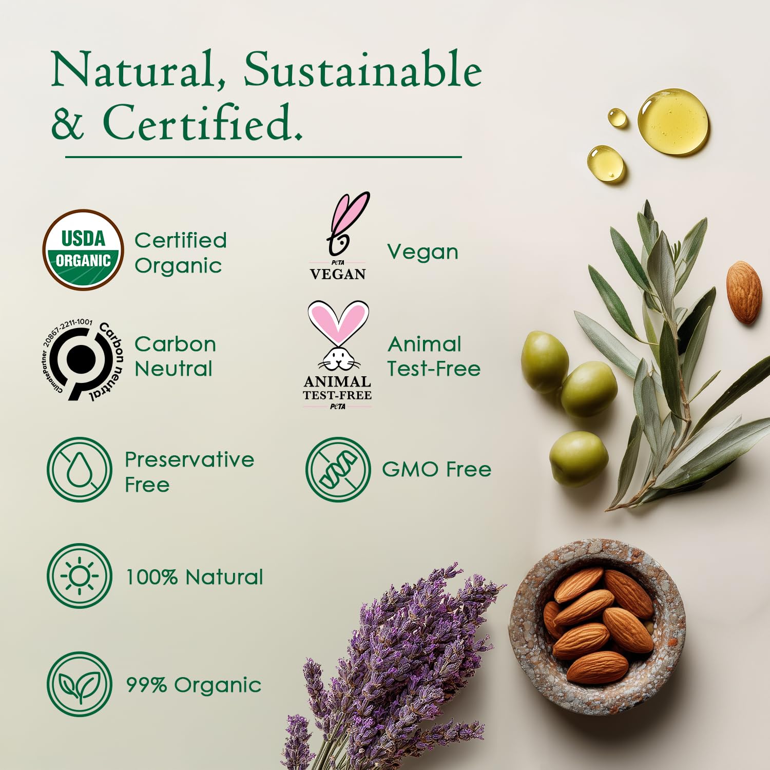 Premium blend of cold-pressed organic plant oils provide maximum nutrient potency. Light, fresh lavender scent. Made without parabens, petroleum, phthalates, or synthetic fragrances. Every ingredient is cruelty-free, vegan, and responsibly sourced.
