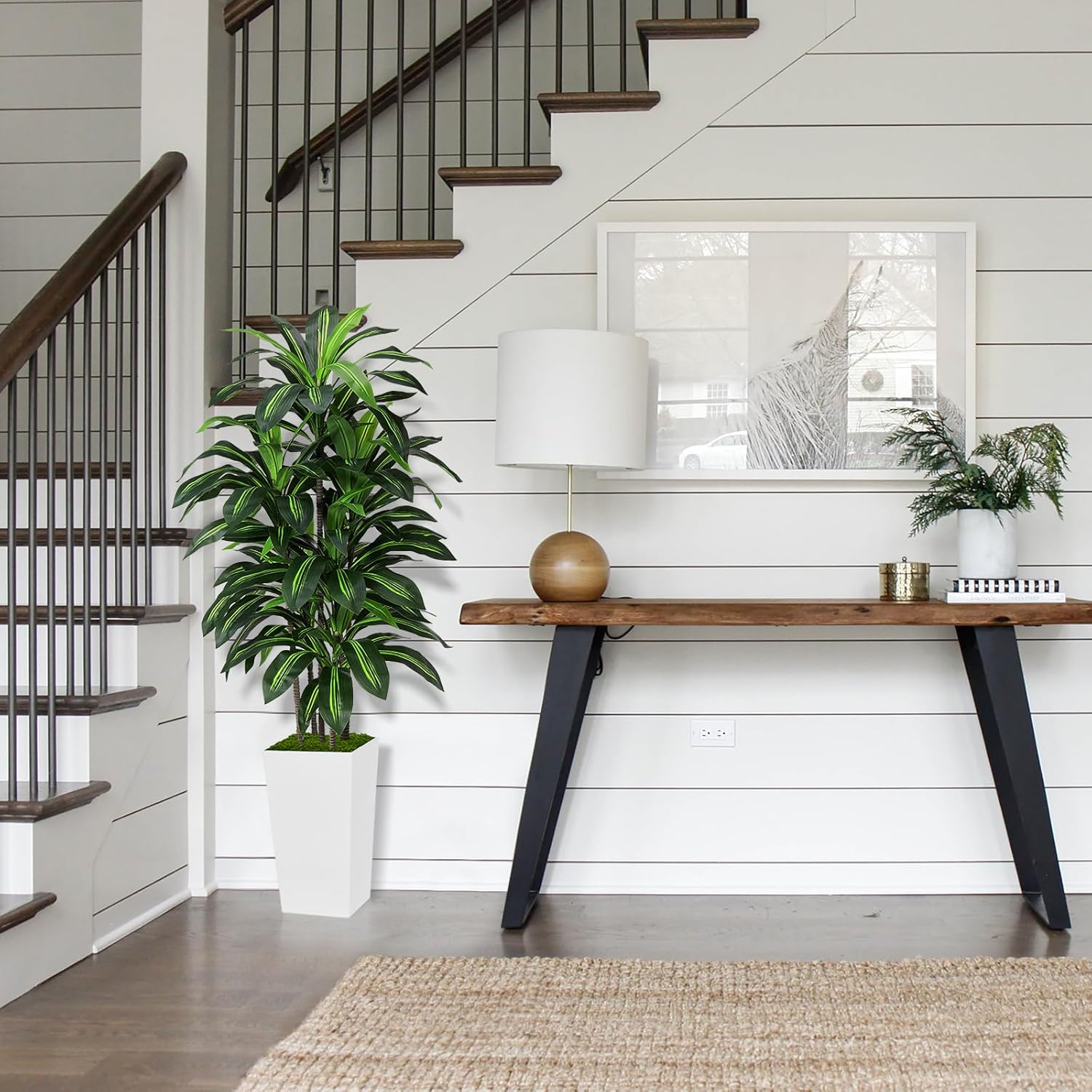 Proportional and Quality Planter: Our planter has been meticulously designed and sized to seamlessly complement our fake dracaena tree, offering a perfect balance of aesthetics and functionality. Additionally, products that include all the essential components: a fake tree, a planter and artificial moss, eliminating the need for extra purchases and saving customers time and effort.