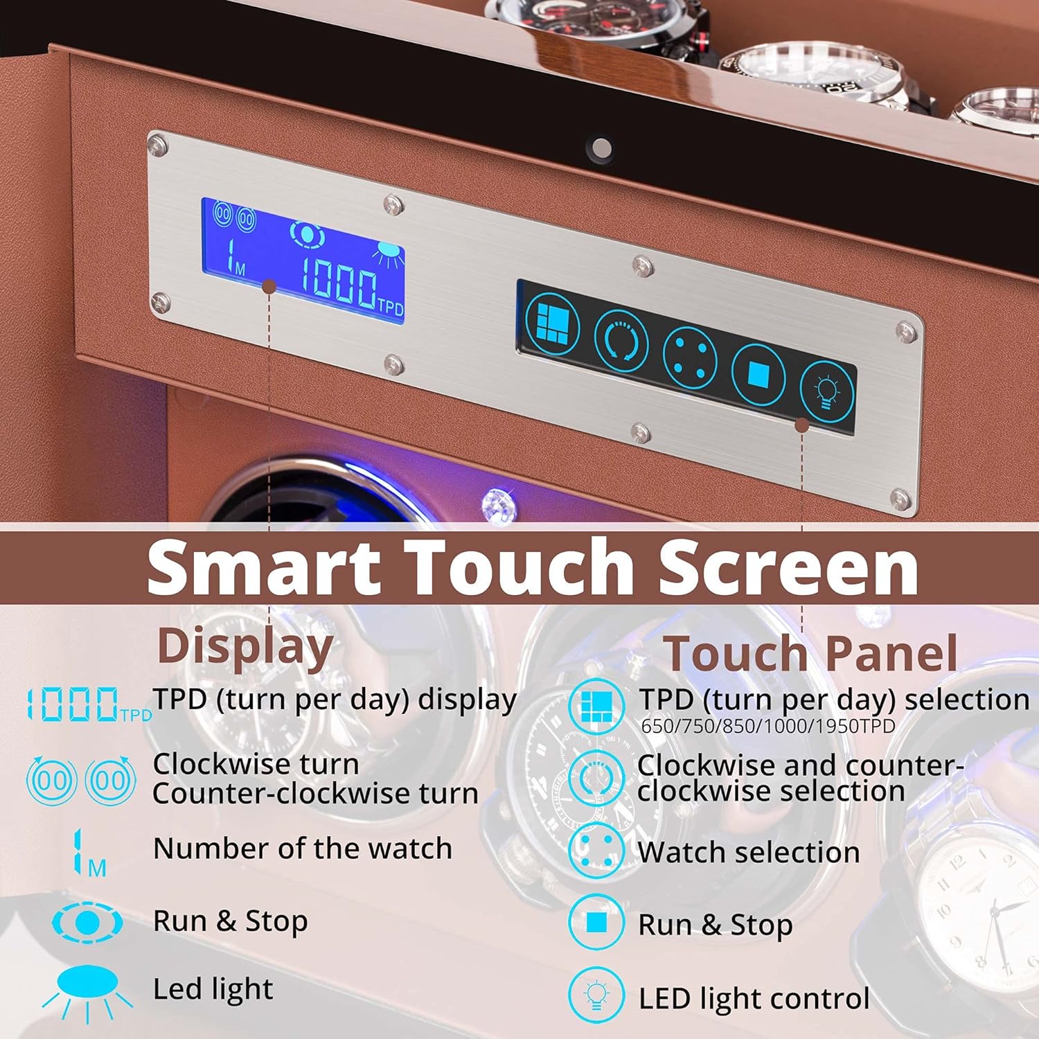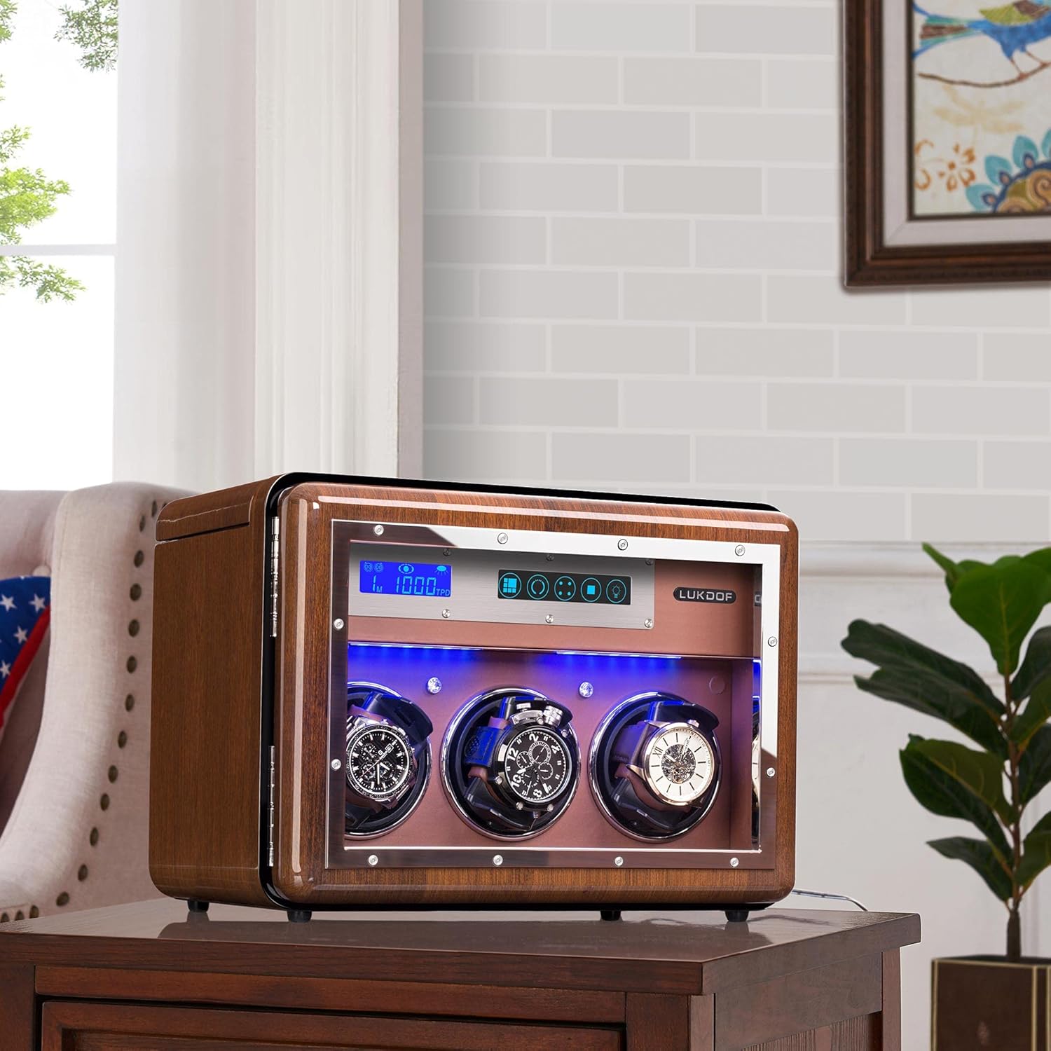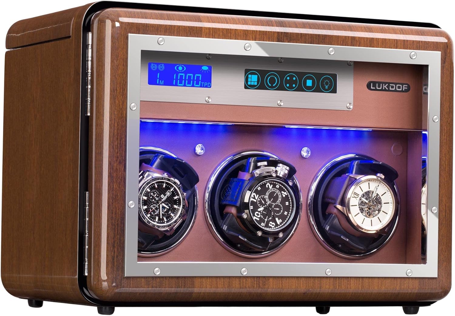 LCD display shows all available information about the operating modes of the watch winder.The watch winder has built in LED lights. Your watches will look especially beautiful in the dark.