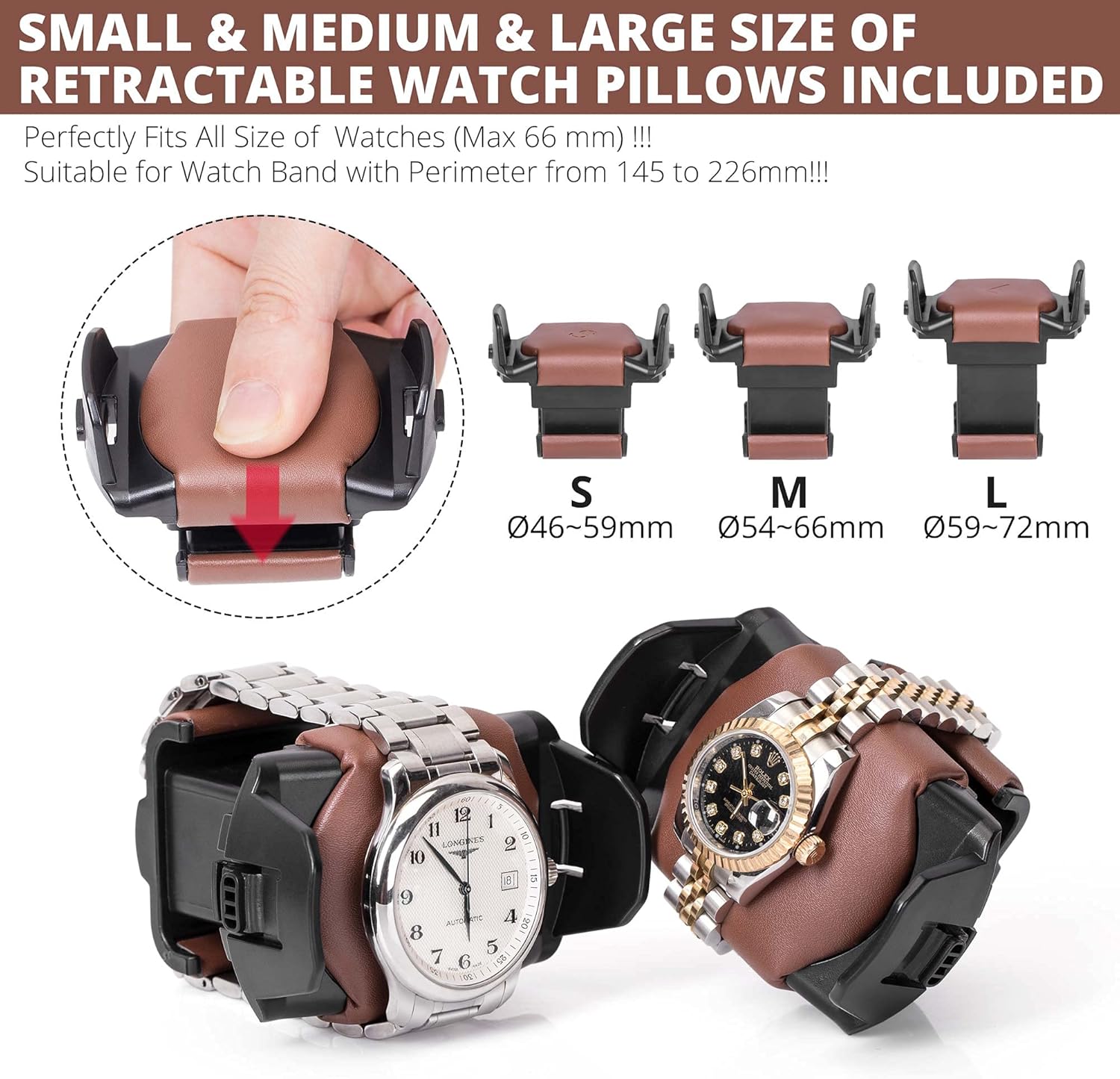 These watch pillow all covered with high quality brown leather. They can work as a great display for your watches.Thoughtful structure design is very easy to adjust the size you want. So that can suit for almost size brand watches. (Max size 67mm)