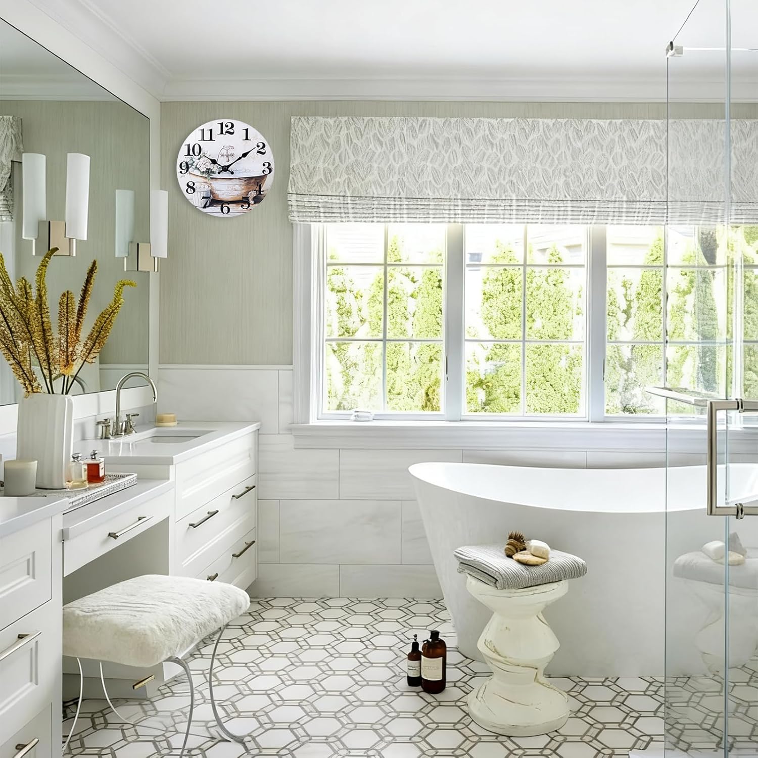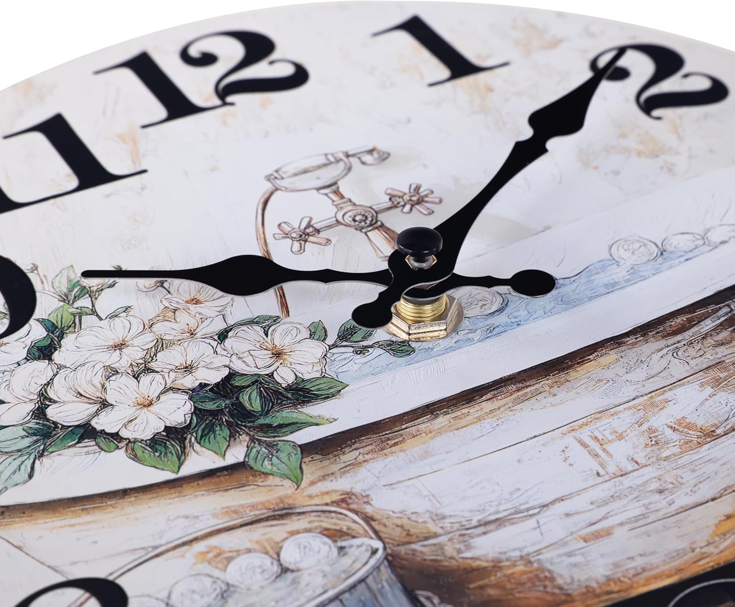 The wall clock incorporates bathtub and floral patterns, allowing it to naturally blend into bathroom or shower.