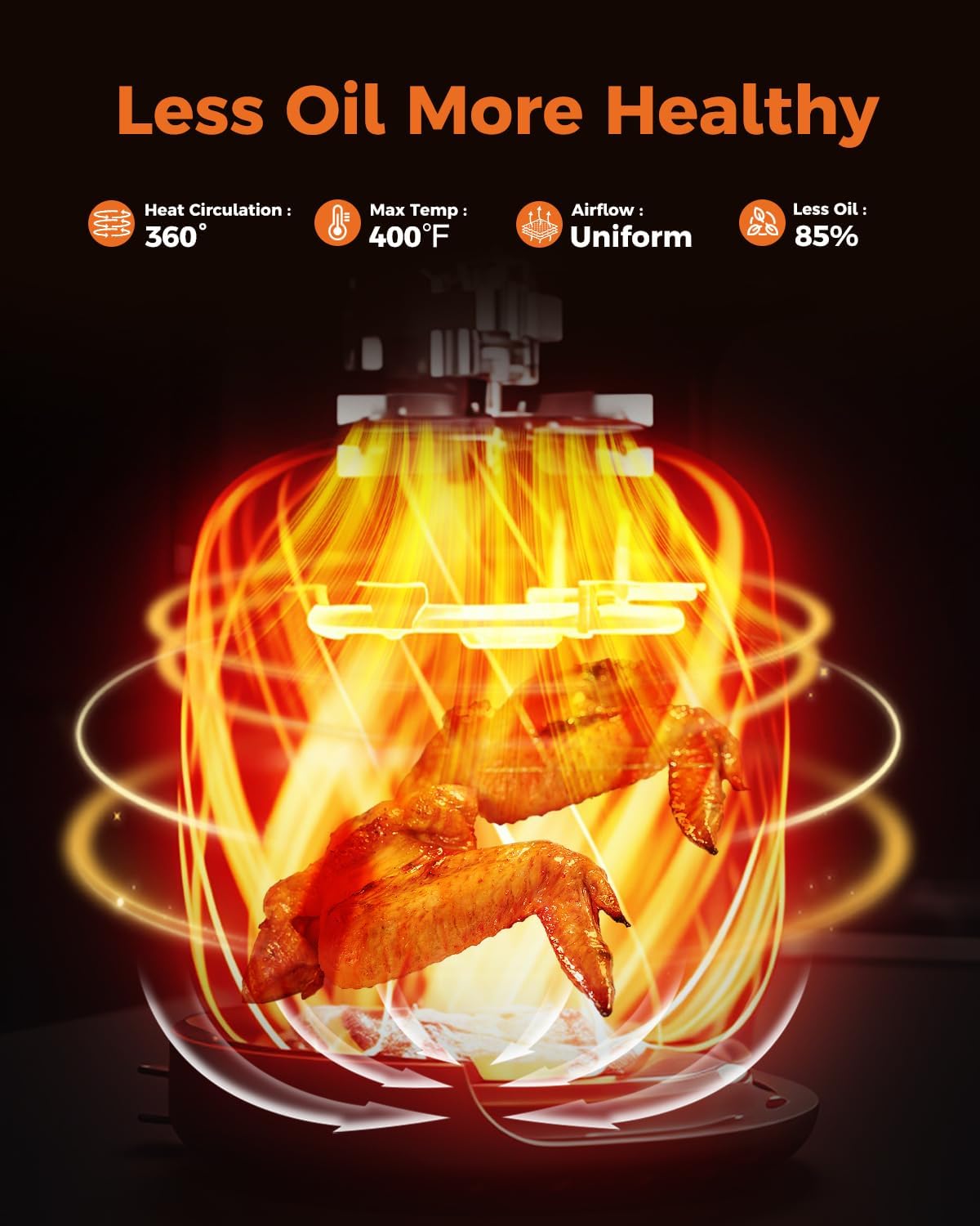 𝐋𝐞𝐬𝐬 𝐎𝐢𝐥 𝐇𝐞𝐚𝐥𝐭𝐡𝐢𝐞𝐫 𝐂𝐨𝐨𝐤𝐢𝐧𝐠: With Rapid Air Circulation 360° airflow to crisp food with 85% less oil, Cooks food 30% faster than traditional ovens frying. Reduced oil use for healthier meals, enjoy crispy foods without the added calories and fats