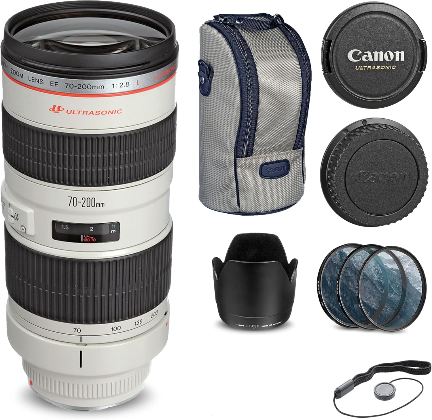 Items Includes: 1 x Canon EF 70-200mm f/2.8L USM Lens, 1 x 77mm 3 Piece Filter Kit, 1 x Lens Cap Keeper