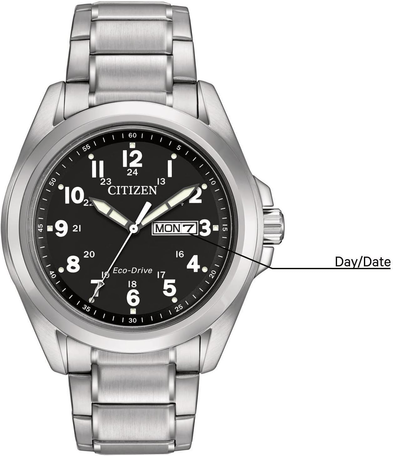 Citizen Men’s Eco-Drive Weekender Garrison Field Watch in Stainless Steel, Black Dial, Arabic Markers, Luminous, 43mm (Model: AW0050-82E)