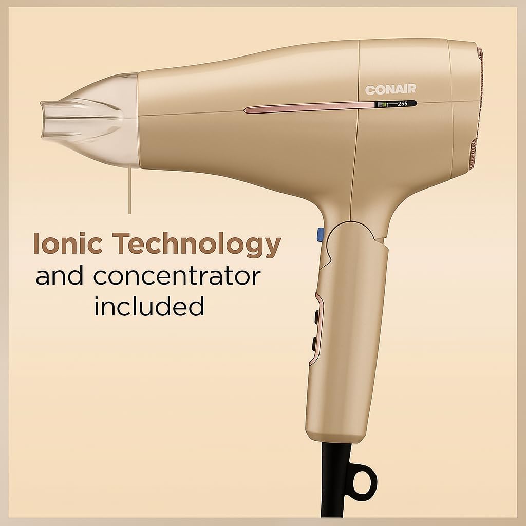 🌍 Worldwide Smart Voltage Technology – Designed for travelers, this dryer automatically detects foreign voltage and adjusts for safe use in 125V or 240V outlets. Perfect for trips across the globe without needing a separate voltage converter. 💨 Powerful & Lightweight – With 1875 watts of fast-drying power packed into a compact design, it delivers salon-quality results while weighing only 1.2 lbs. ✨ Ionic Technology – Reduces frizz and boosts shine, leaving hair smooth and manageable. Ideal for all hair types. 🔥 Custom Heat & Speed Settings – Choose from 3 heat settings and 2 speeds for flexible styling. Includes a Cool Shot button to set styles in place. 👝 Compact & Travel-Friendly – Features a folding handle for easy packing in suitcases or carry-ons. Designed to save space without sacrificing performance. 🎯 Styling Attachments Included – Comes with both a concentrator nozzle for sleek, polished styles and a diffuser for enhancing natural curls and waves. Product Highlights: Sleek Champagne Gold finish for a premium, modern look. Award-winning: Recognized by Good Housekeeping for performance and reliability. Travel-ready, compact, and powerful – the perfect styling companion for business trips, vacations, or daily use. ✅ Perfect for travelers who want salon-quality styling anywhere in the world.