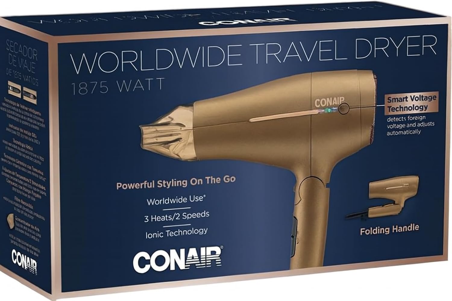Conair 1875W Worldwide Travel Hair Dryer – Dual Voltage, Folding Handle, Ionic Technology – Champagne Compact Travel Blow Dryer for International Use