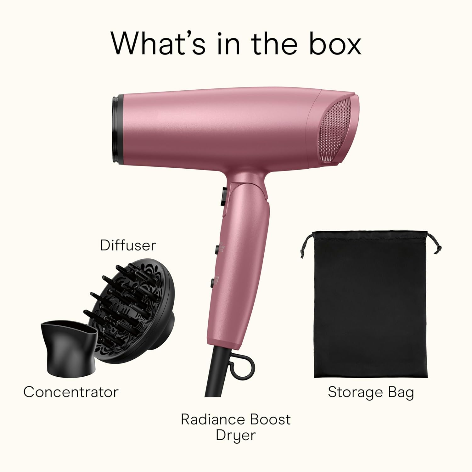 Conair Hair Dryer with Diffuser and Folding Handle, 1875W Travel Blow Dryer with Concentrator, Radiance Boost with Nano-Quartz Ceramic for Less Frizz, More Shine, and Silky Hair, Dusty Rose