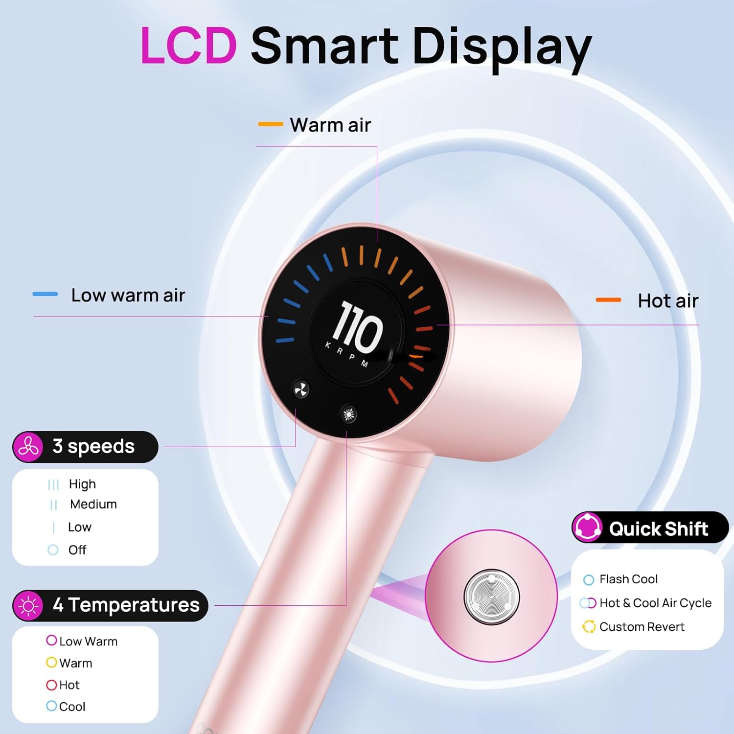 Customizable Intelligent Temperature and LCD: Hair dryer customize 4 heat settings (low warm, warm, hot, cool) and 3 speeds (75K, 95K, 110K RPM) easily, giving you a customizable dry experience. Quick Shift button can instantly switch to cool air, hot/cool air cycle, or reverts to your custom Settings. It accurately meets the needs of different hair types and combines professional efficiency with safe and gentle, meeting the diverse needs of pet care and sensitive scalp protection for children/seniors