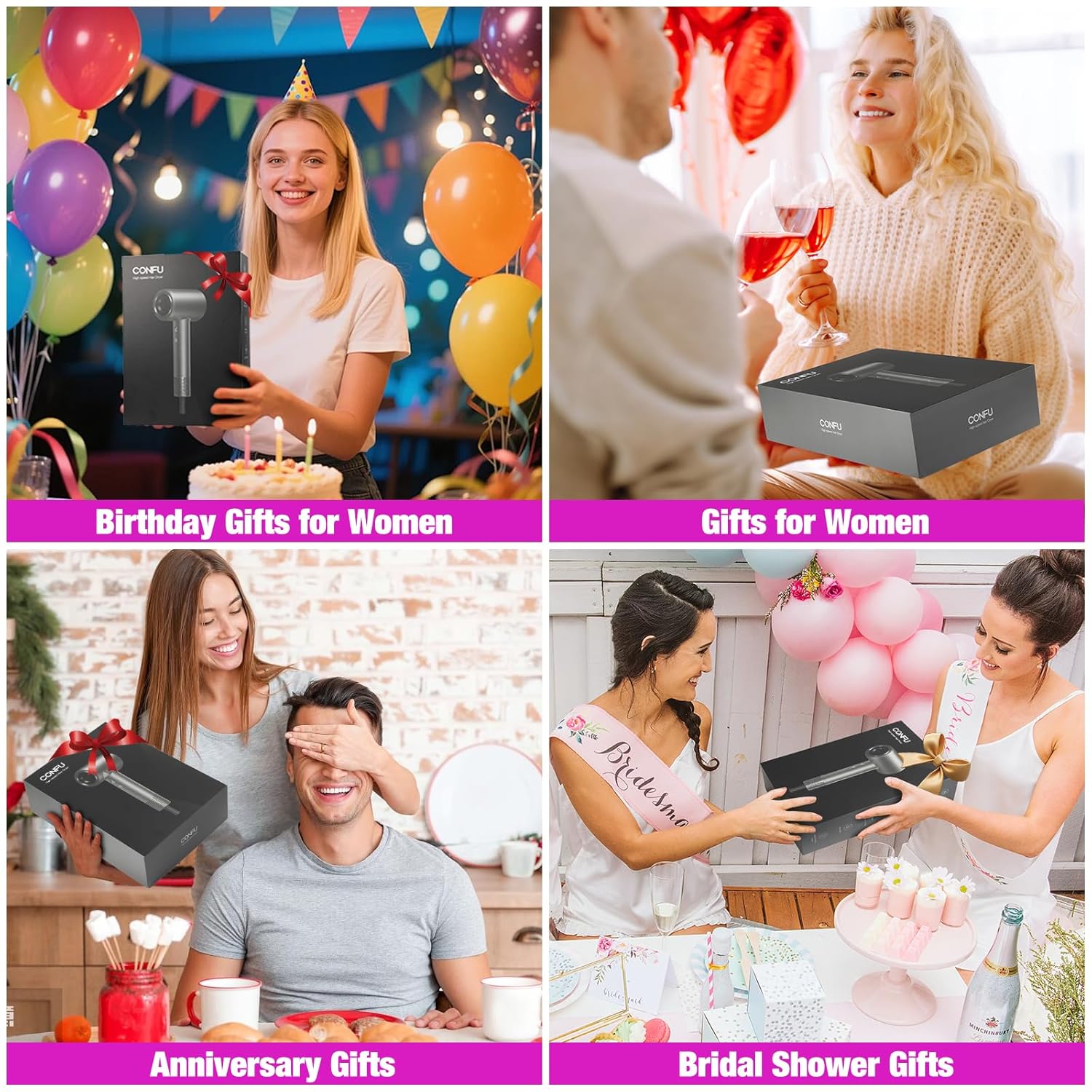 Ionic Technology, Magnetic Attachments: CONFU blow dryer includes two magnetic attachments and utilizes advanced ionic technology that emits 500 million negative ions to reduce static and frizz, leaving hair sleek