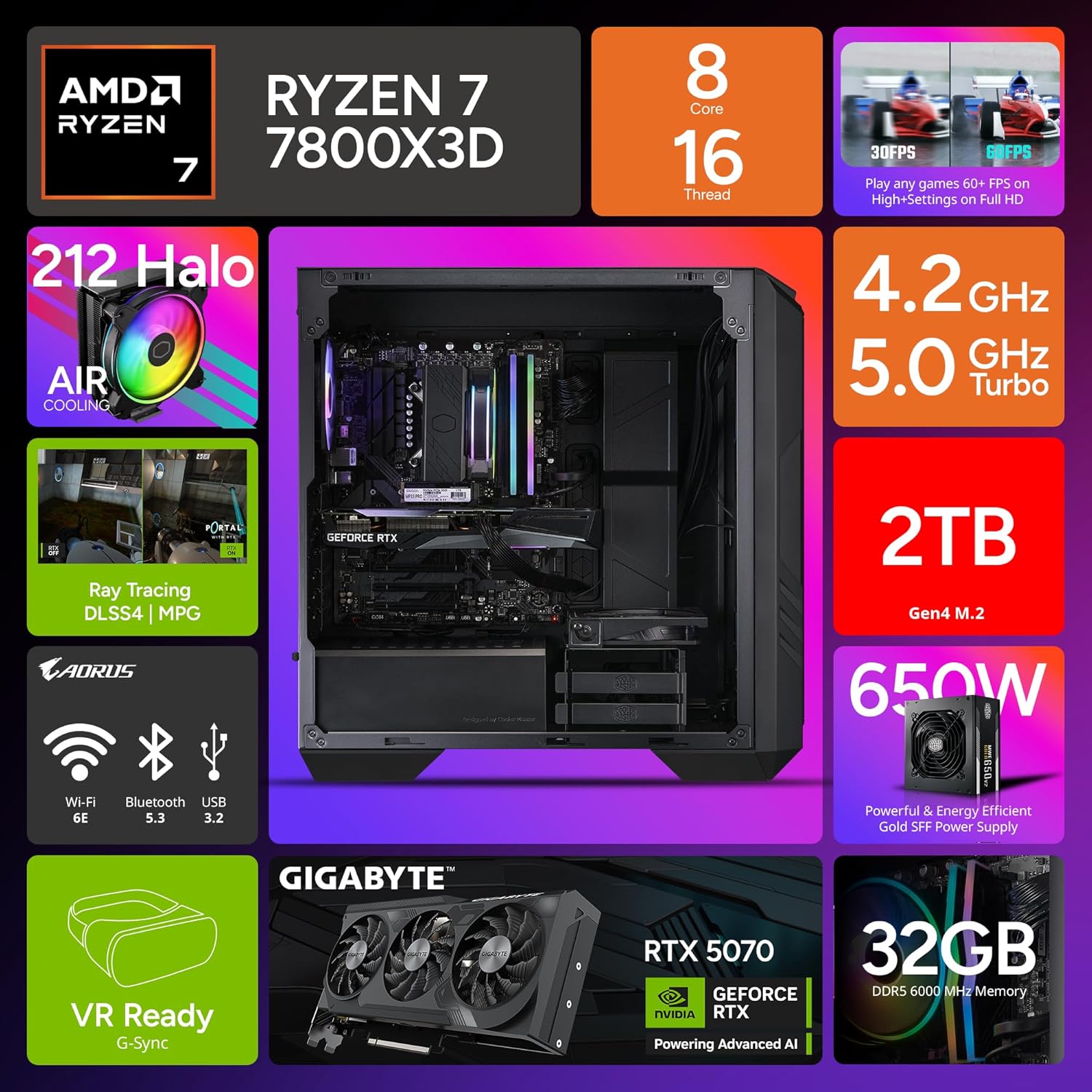 Cooler Master HAF 5 Pro AMD RYZEN 7 7800X3D 4.2 GHz | Gigabyte RTX 5070 12GB & B650 Motherboard | 32GB (2x16GB) DDR5 6000MHz | 2TB Gen4 M.2 | WiFi | Windows 11 | Hyper 212 Halo Cooler Gaming PC