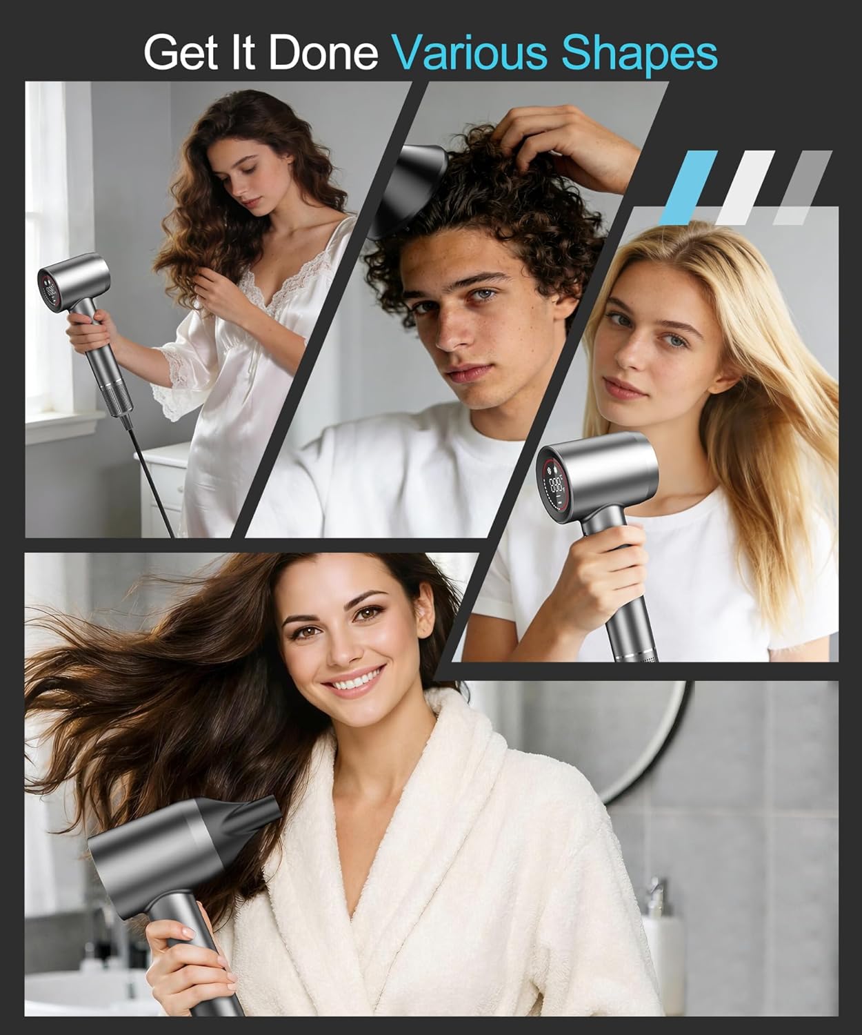 HD Digital Display: Our hair dryer with attachments offers 5 heat settings (Room Temperature/110°F/140°F/150°F/ 170°F) and 2 speed settings for a total of 10 different combinations. This allows you to customize the drying combination that suits your hair and meets people’s different drying needs. And the HD LCD display of the hairdryer allows you to easily adjust the settings