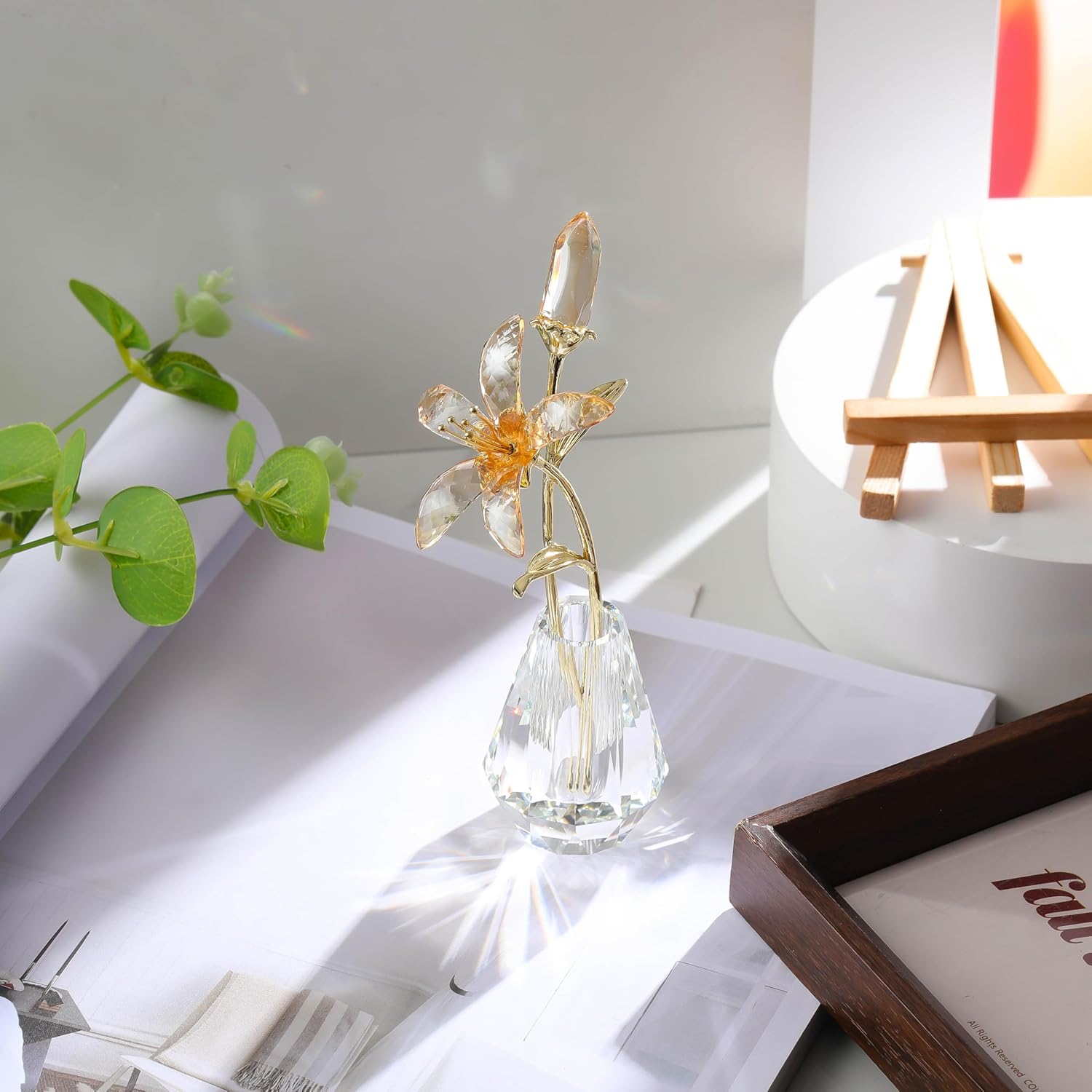 Elegant Design: This timeless design depicts a lily flower, a symbol of prosperity and abundance. It will add color and sparkle to any interior. Elegantly displayed in a faceted clear crystal vase, the flower shines in crystal, with a metal stem. It will make a great gift idea to mark a special occasion