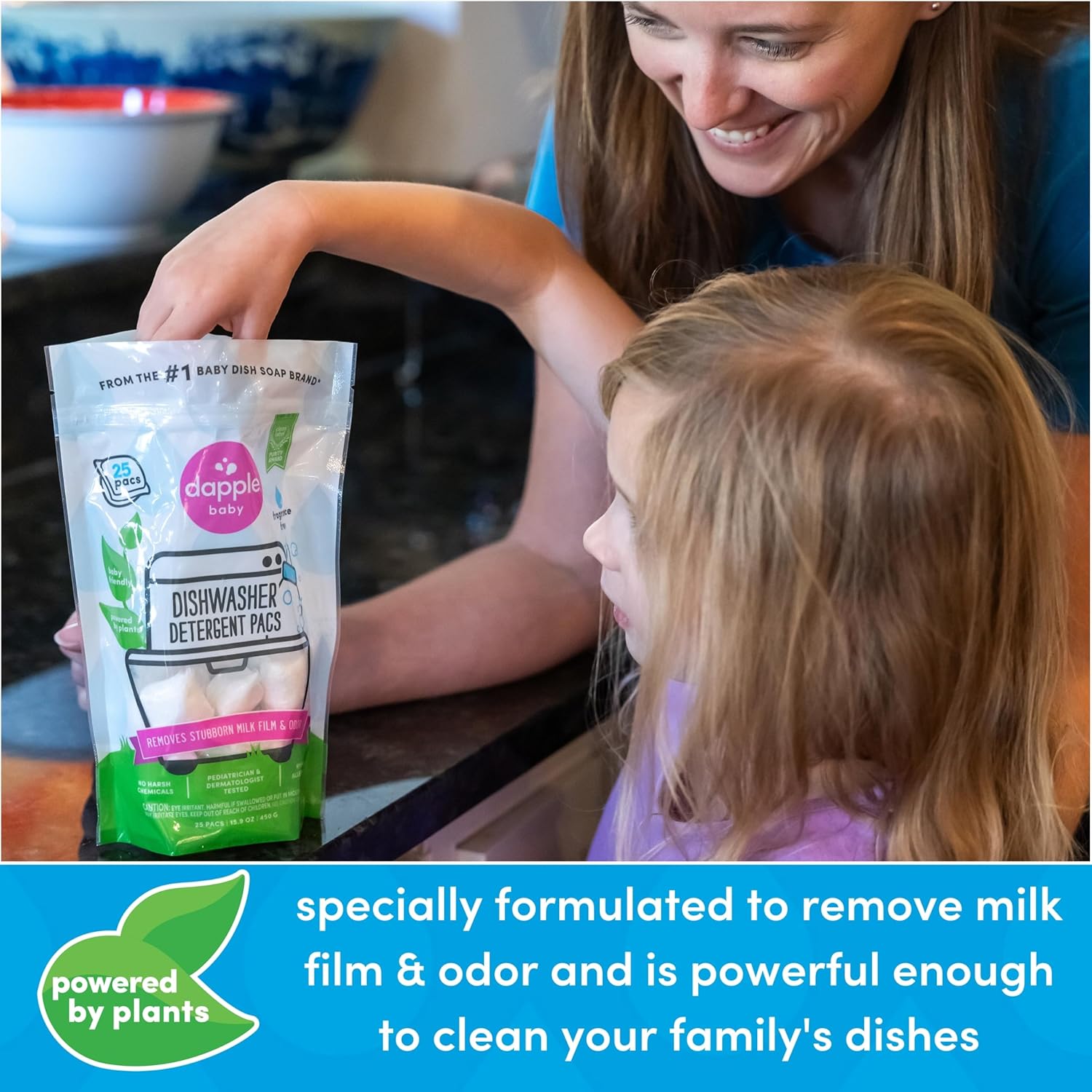 FROM THE #1 BABY DISH SOAP BRAND*: Dapple Baby Dishwasher Detergent Pacs are baby friendly, made without harsh chemicals and powered by plants to remove stubborn milk film and odor.