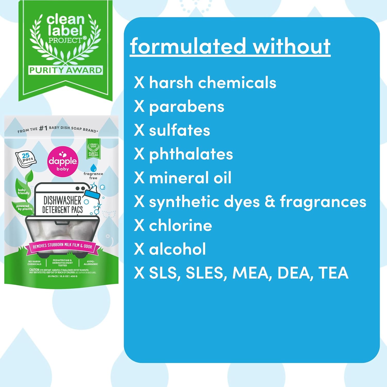 MINDFUL INGREDIENTS: Dapple Baby Dishwasher Detergent Pacs are a Clean Label Project Purity Award Winner for clean and pure ingredients. They are pediatrician and dermatologist tested, hypoallergenic, made with plant-based ingredients and without harsh chemicals, parabens, sulfates, phthalates, mineral oil, synthetic dyes & fragrances, chlorine, alcohol, SLS, SLES, MEA, DEA, TEA.