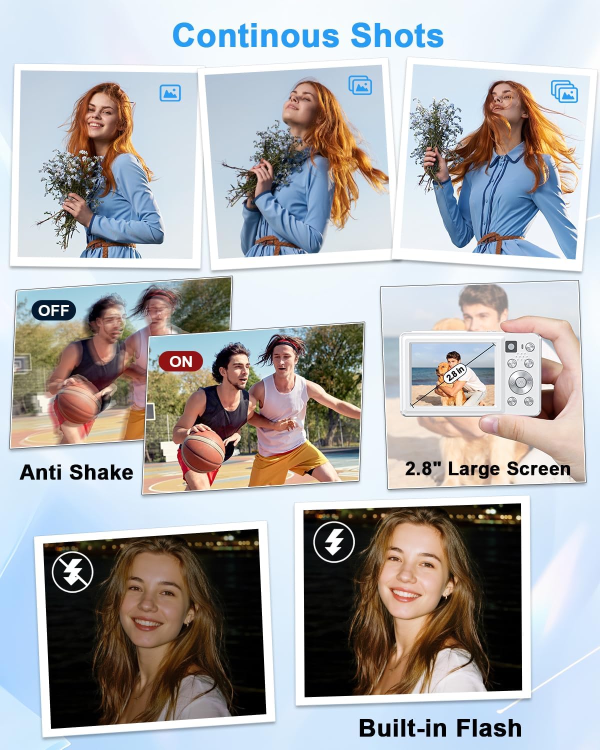 【Dual Camera System with Autofocus】One Key turns front camera to rear camera, the vlogging camera captures amazing shots from any angle. Plus, the small digital camera features responsive autofocus and flash for sharp, high-quality images—whether you’re shooting portraits, travel scenes, or night photography.