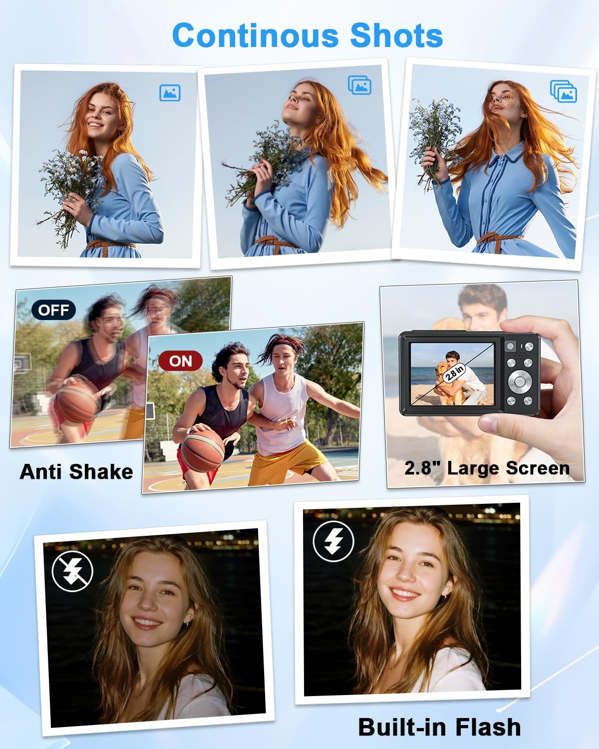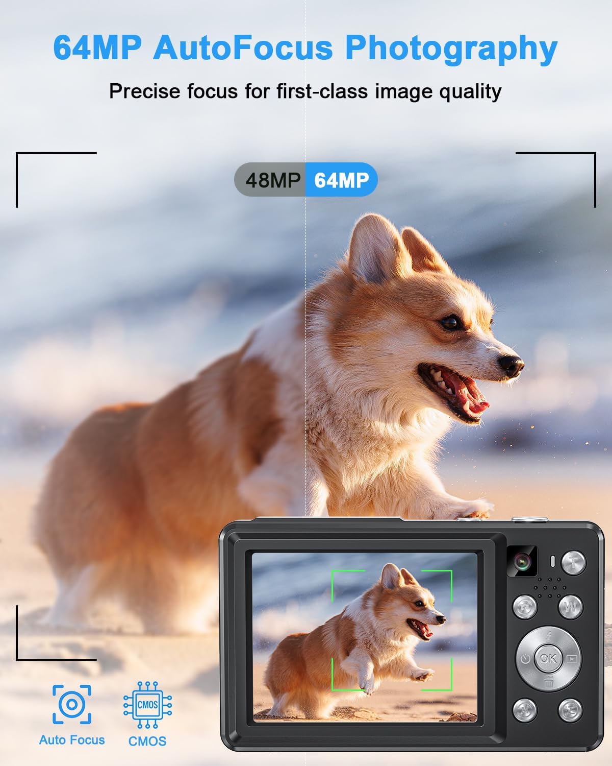 【Dual Camera System with Autofocus】One Key turns front camera to rear camera, the vlogging camera captures amazing shots from any angle. Plus, the small digital camera features responsive autofocus and flash for sharp, high-quality images—whether you’re shooting portraits, travel scenes, or night photography.