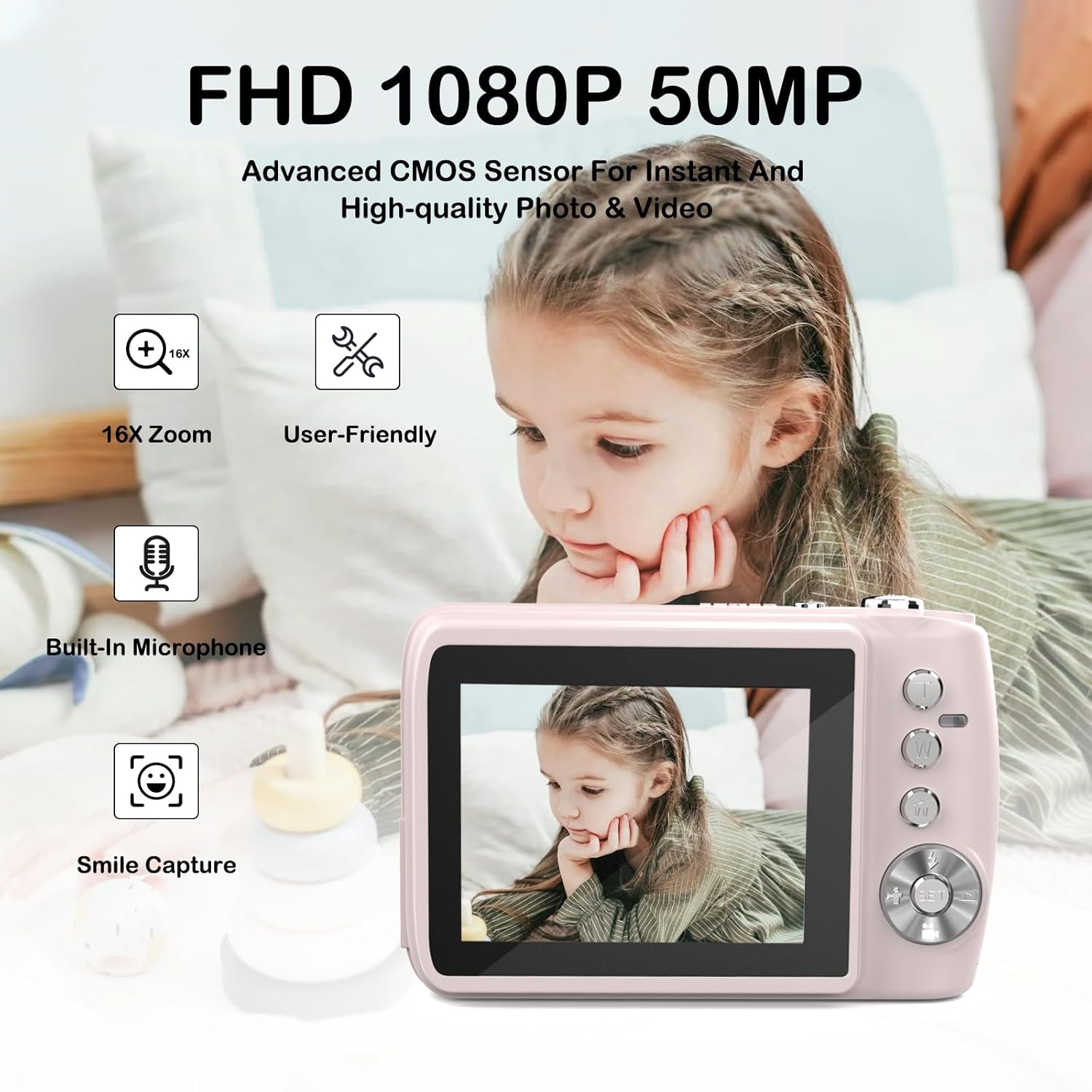 【High Performance+Compact Body】 This pink digital camera features 16X steady zoom, allowing you to effortlessly capture detailed shots of distant subjects. Its anti-shake technology eliminates motion blur, ensuring crisp, pro-level shots on the go. With the latest CMOS metering system, it delivers FHD 1080P high-clarity videos and 50MP photos with natural colors automatically—no complicated manual settings needed. Just press the shutter in one second, making it ultra-easy for beginners and kids to shoot like pros.