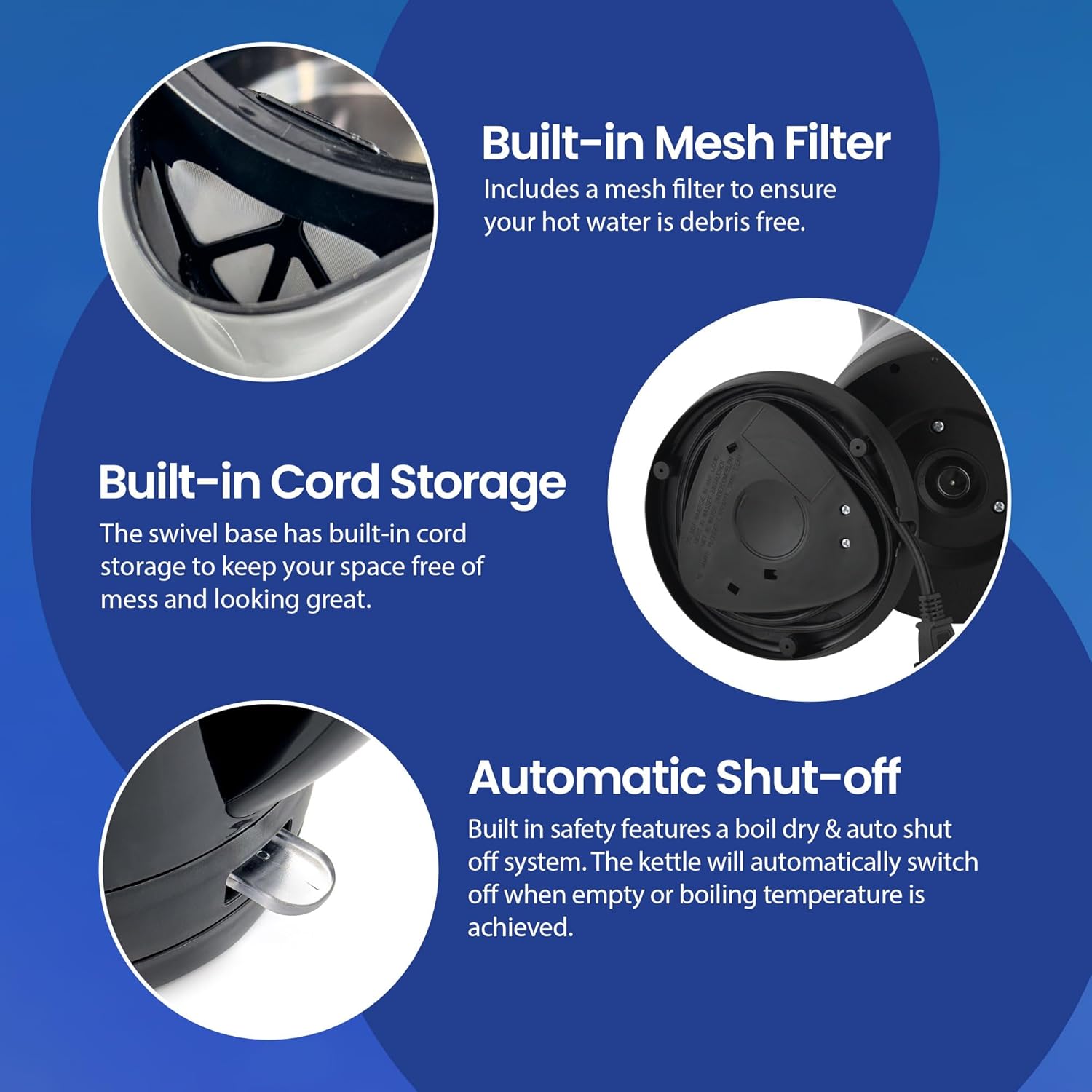 EASE OF USE: One-touch lever to begin boiling with high efficiency concealed heating system with Auto-Shut Off and Boil-Dry Protection for safe use. Clearview window with water level markings and a 360° swivel base for cord free serving.