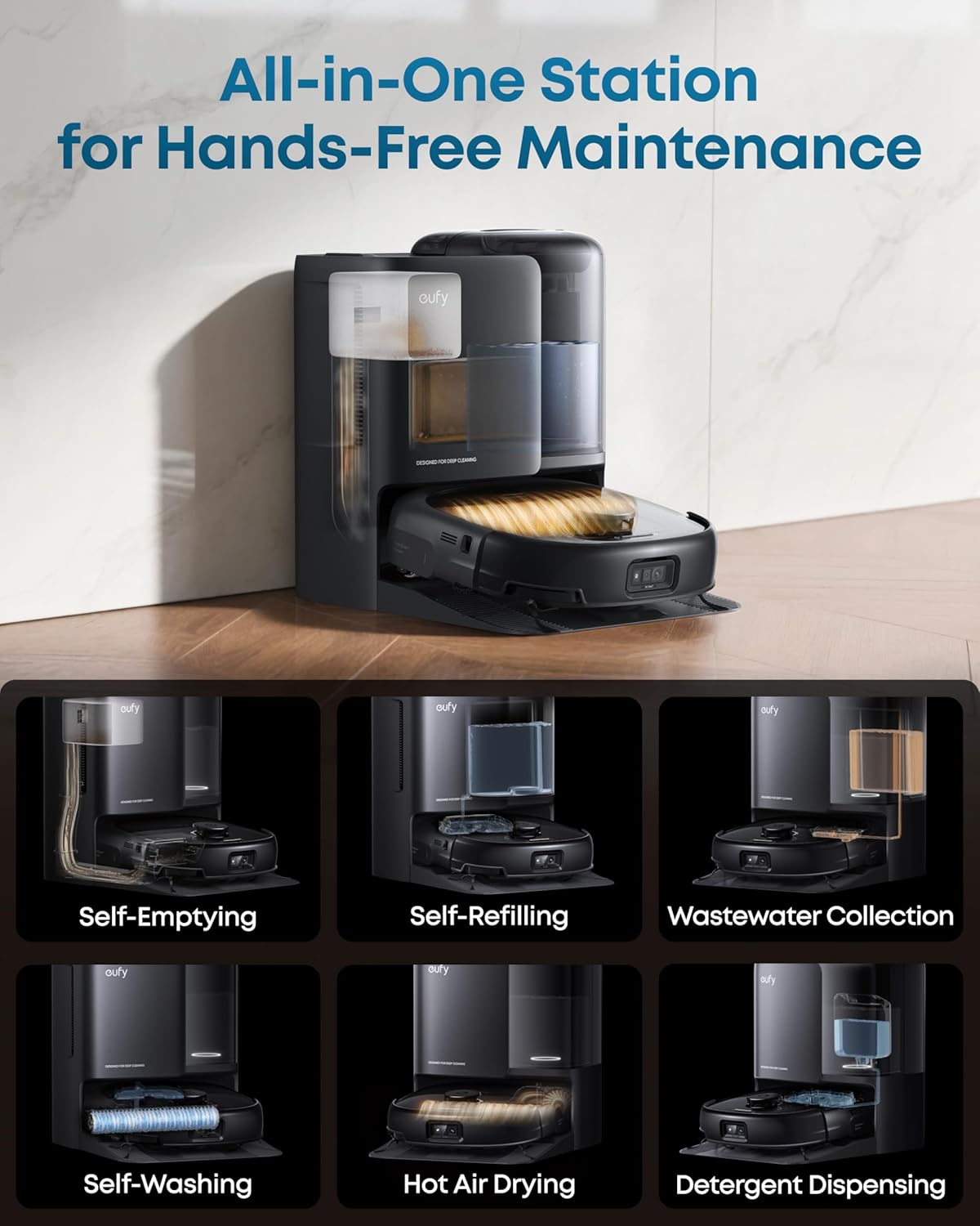 All-in-One Station for Effortless Whole-Home Cleaning: Streamline your routine with automated self-emptying, self-washing roller mops, self-refilling, hot air drying, and more—delivering complete hands-free convenience.