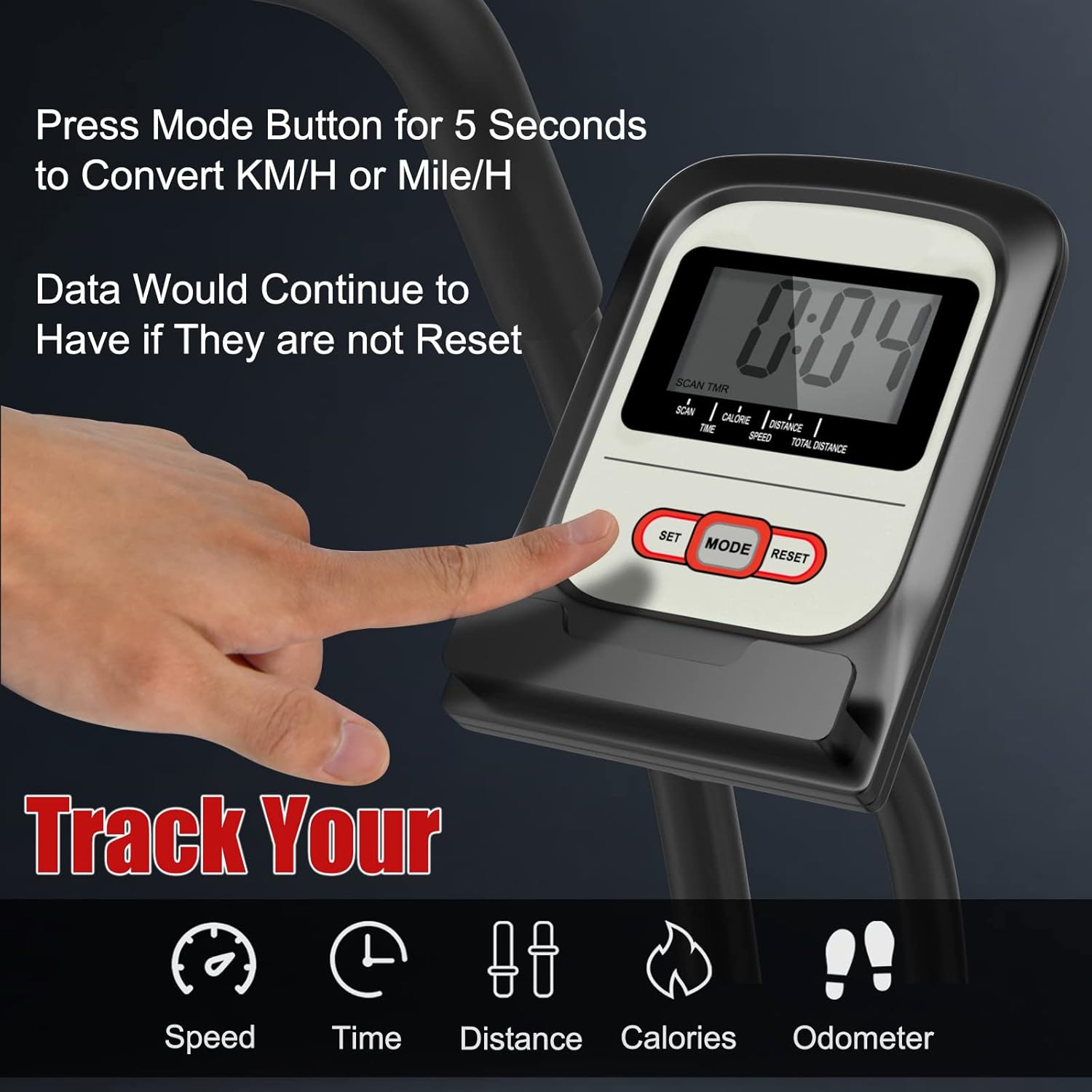 【Clear LCD Digital Monitor】 In order to feedback your exercise data in real time, this fan bike is equipped with a clear LCD display, conveniently tracking your time, speed, distance, calorie and total distance. Besides, you can press the mode button for 5 seconds to convert km/h or mile/h for your preference. And the device holder allows you to put your phone or tablet with ease.