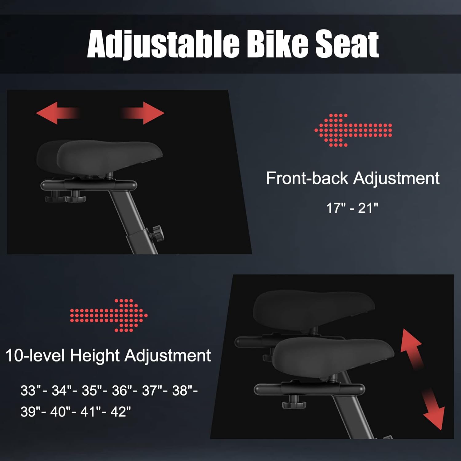 【4-way Front-Back & 10-level Height Seat】 This air bike features a 4-way adjustable seat, which means the seat has front-back adjustment (17” – 21”) and 10-level height adjustment (42”/41”/40”/39”/38”/37”/36”/35”/34”/33”) to adapt to the use of different groups of people. And the cozy seat is covered with waterproof PVC leather and padded with soft PU foam for ultimate comfort.