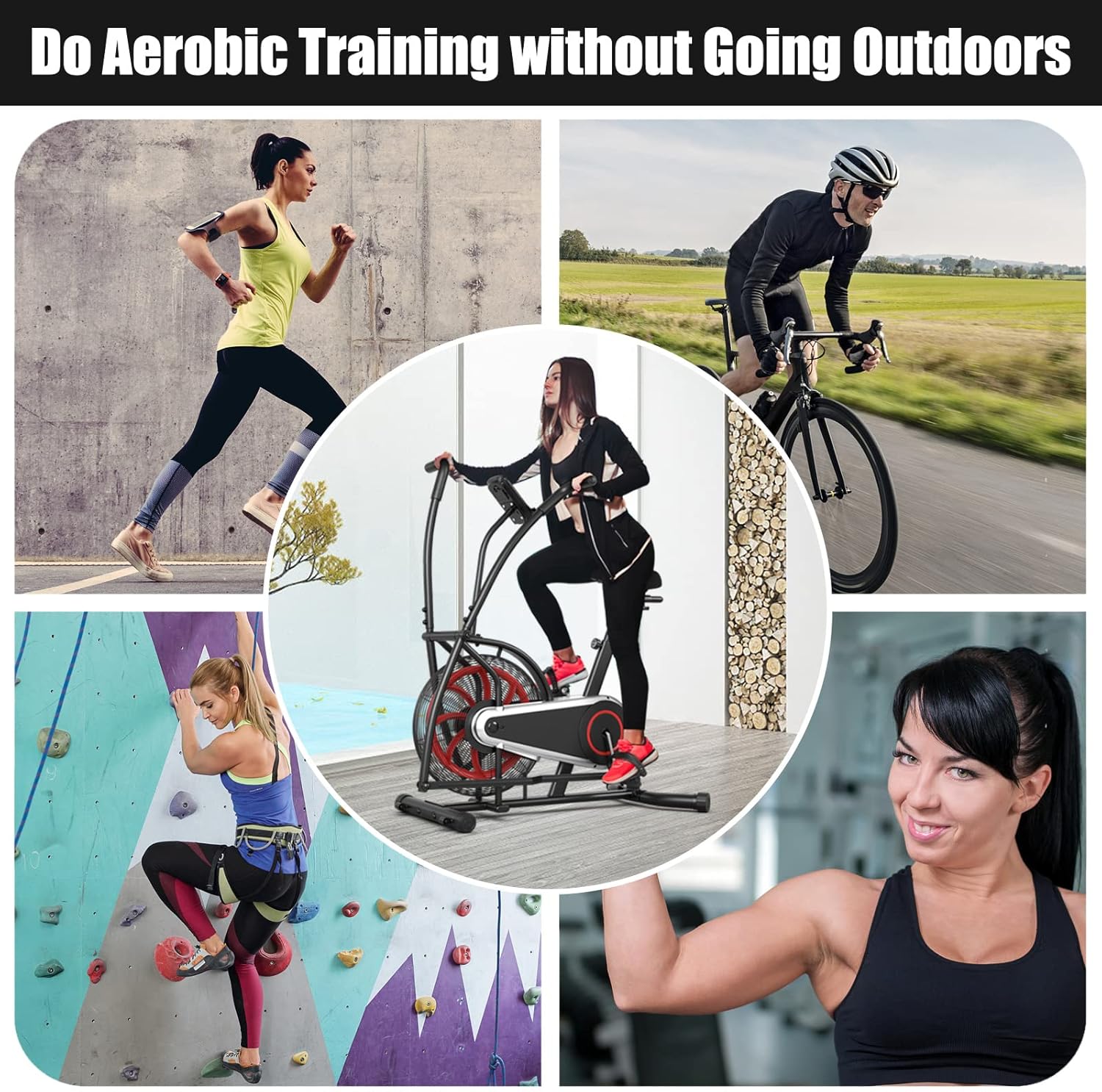 【Air Resistance System】 Using 8 fan blades as its unique air resistance system, this fan exercise bike provides unlimited resistance for your workout. The faster you ride, the more resistance there is. Meanwhile, the fan will produce cool air while riding. And the double-stage belt and chain drive mechanism ensures smoother ride.