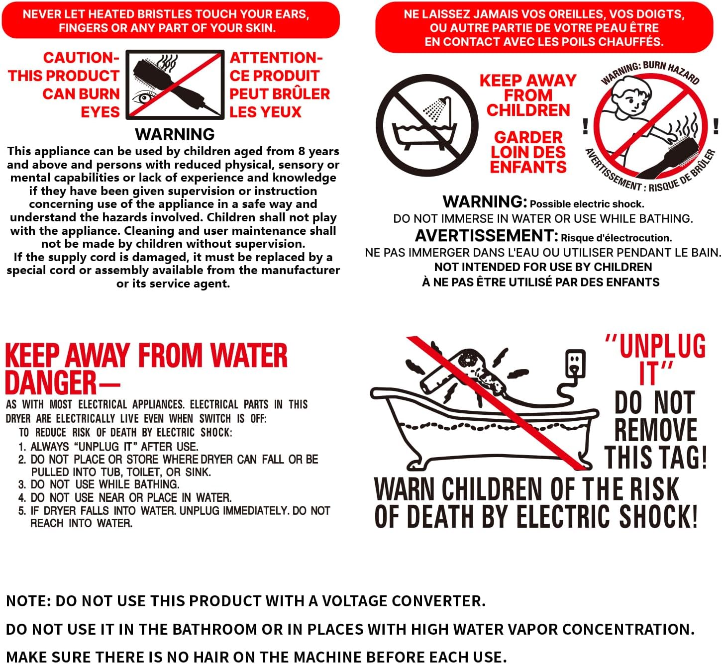 Safe Use: Please read the user manual carefully before use. Our blowout brush comes with the ALCI plug, which meets U.S. safety requirements and features the ETL Certification. Note: Unit is designed for 110-120 Volt USA outlets only. DO NOT use a voltage converter or adapter as it will damage the unit. DO NOT use it in bathrooms or places with high moisture concentration. To extend the life of this hair dryer brush, use a cleaning brush after each use to remove the hair left on the machine