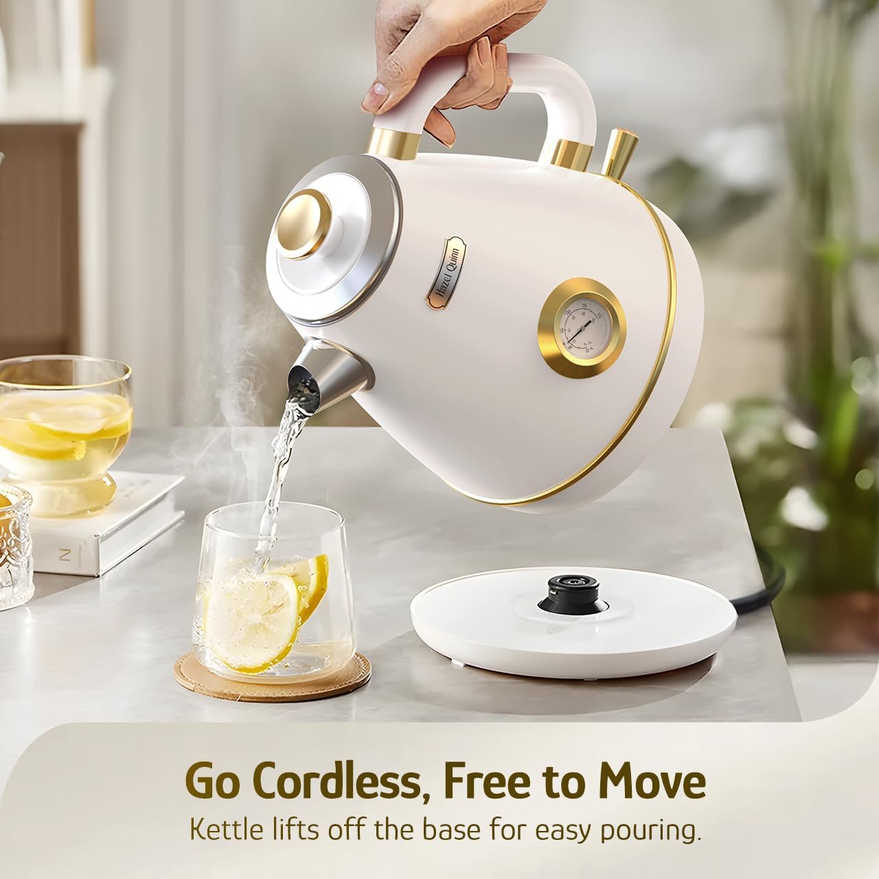 Hazel Quinn Retro Electric Kettle – 1.7 Liters / 57.5 Ounces Tea Kettle with Thermometer, All Stainless Steel, 1200 Watts Fast Boiling, BPA-free, Cordless, Automatic Shut Off – Pearl White