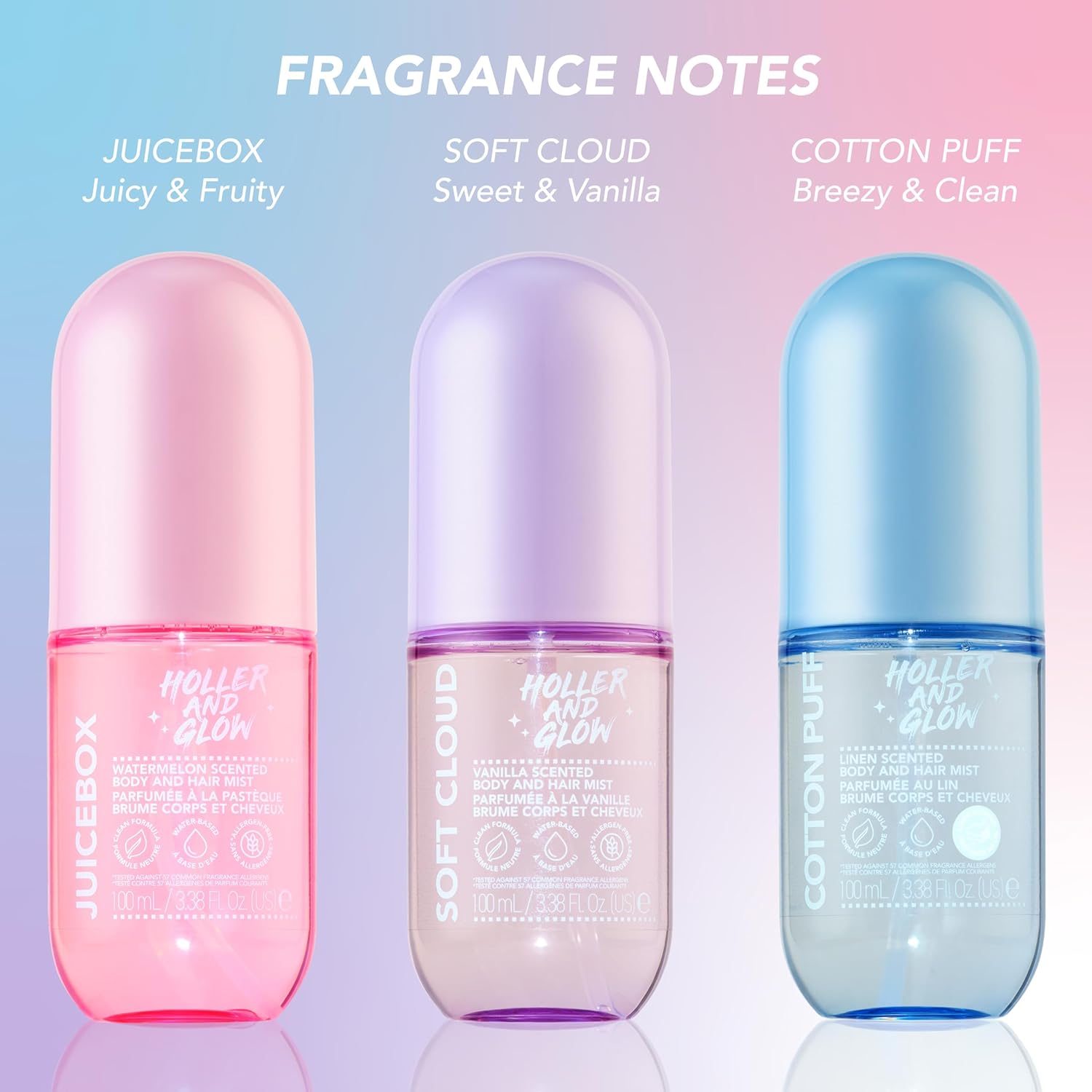 Hair & Body Mist – Get a refreshing burst of sweet goodness with just a light spritz of our Holler And Glow Mood Boosting Soft Cloud Body & Hair Mist. Formulated with notes of vanilla, coconut, and amber