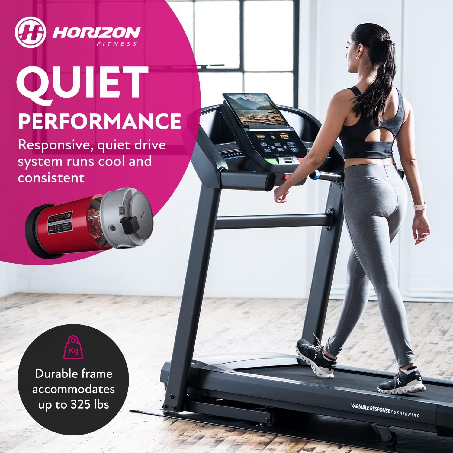 UPGRADED MODEL: Stepping up from Horizon treadmill T101, the T202 offers a longer 60″ deck, 12% incline, and 12 MPH maximum speed. Users looking for a treadmill 300+ lb capacity can use the T202 walk machine confidently with its 325lb / 147kg weight capacity.