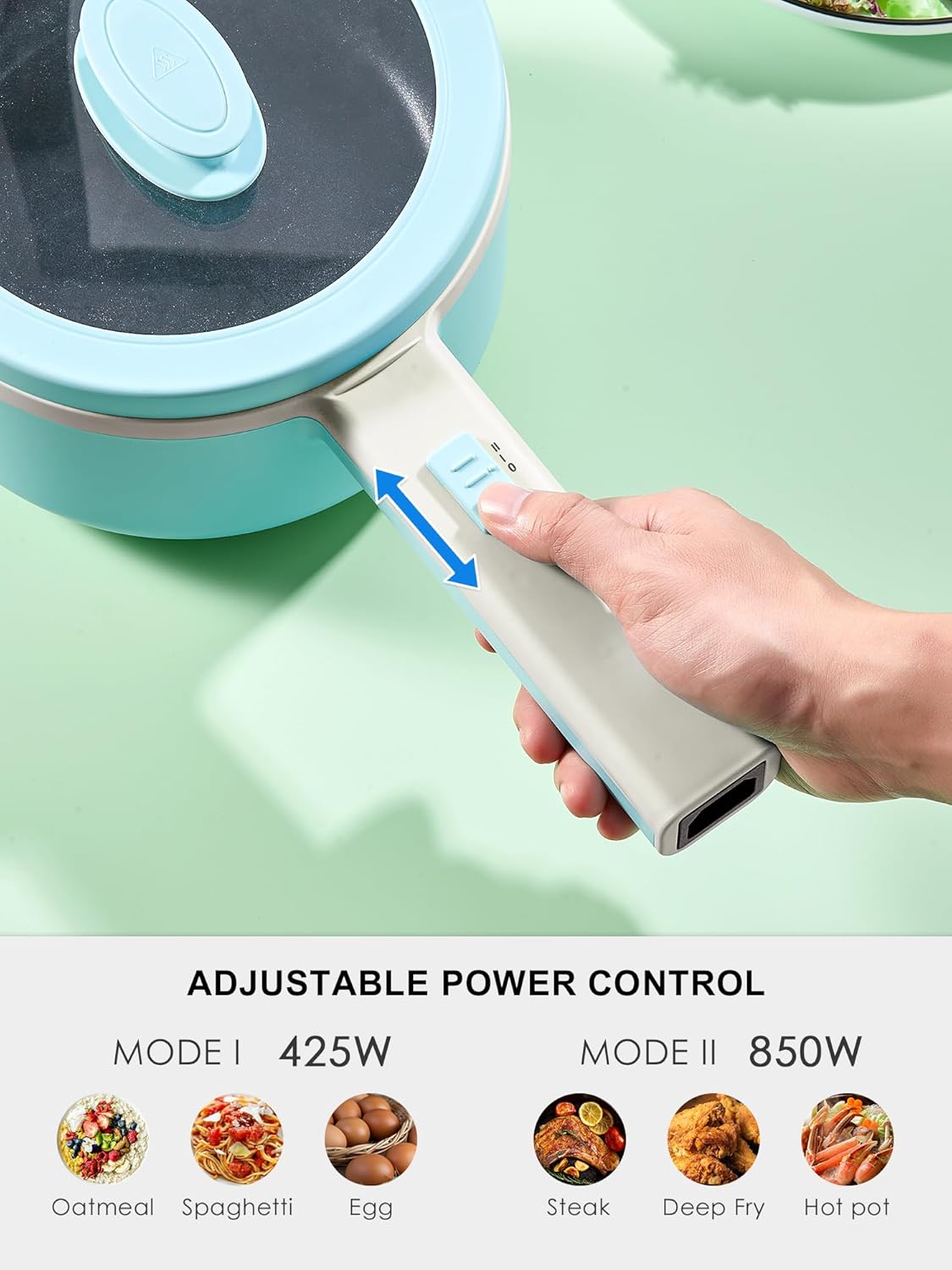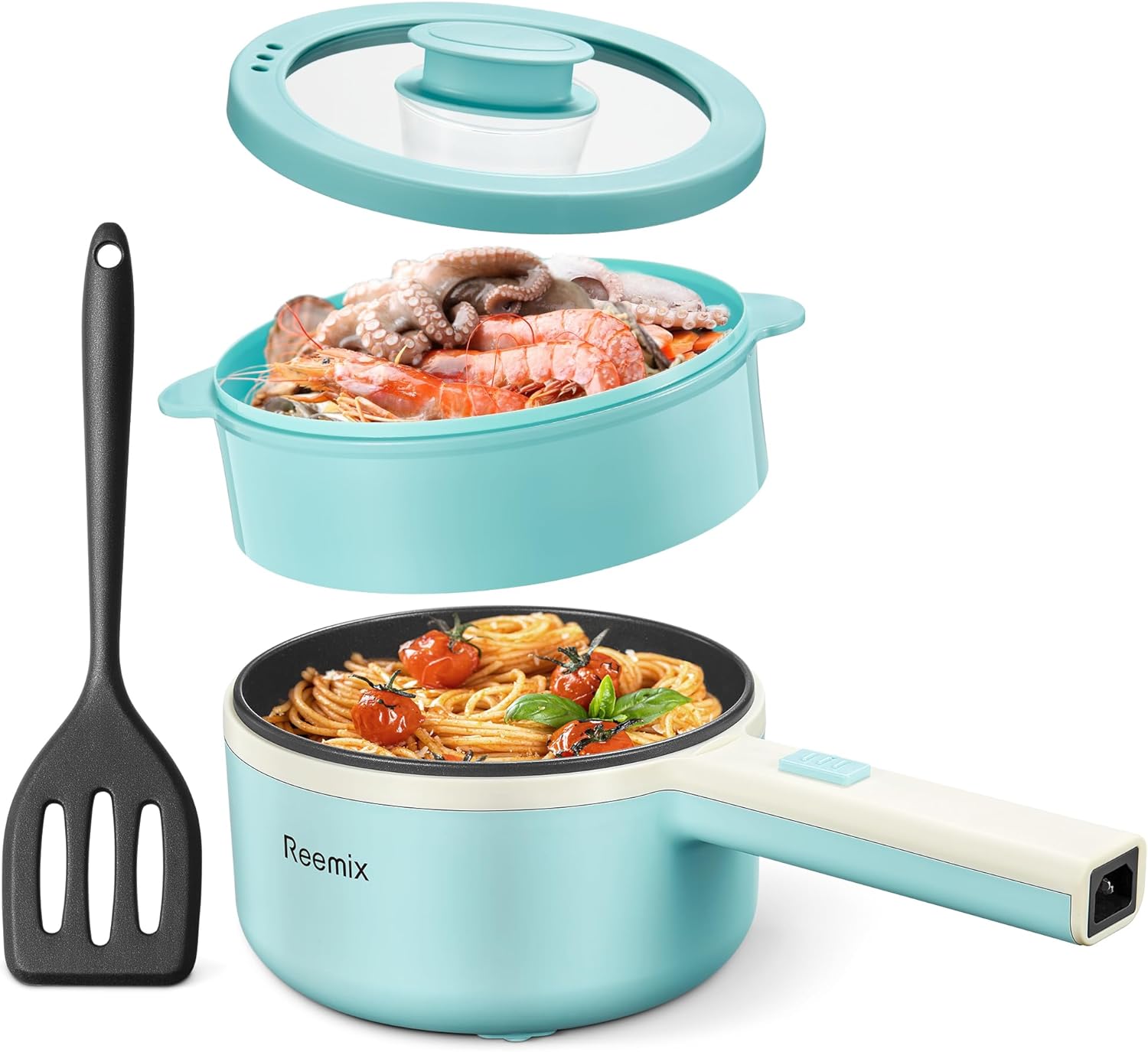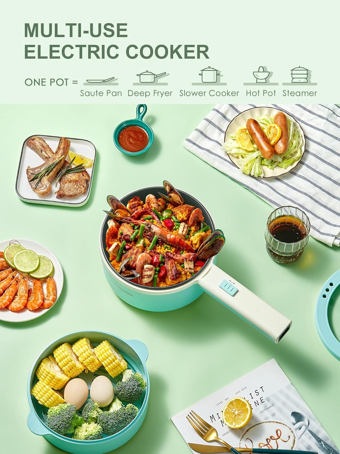 Hot Pot Electric With Steamer, 1.6L Ramen Cooker Non-Stick Sauté Pan for Steak, Egg, Fried Rice, Ramen, Oatmeal, Soup, Portable Personal Perfect Suit Dorm Room and Apartment (Aqua)