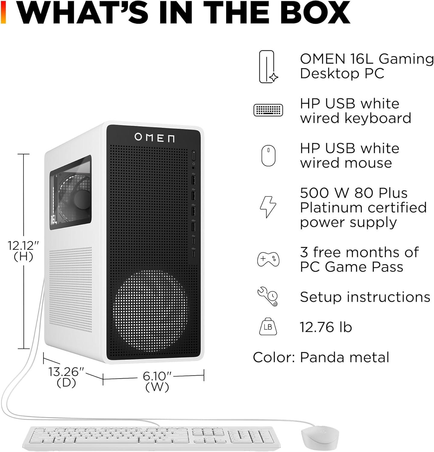 Unwind with the OMEN 16L Gaming Desktop PC. With an Intel Core Ultra 5 225F processor and high-performance graphics, it delivers elevated performance in a compact size. Customize your PC with RGB effects through OMEN Light Studio and get personalized settings recommendations with OMEN AI. The 16L is the perfect companion for your next adventure. This HP computer comes with an HP USB white wired keyboard, HP USB white wired mouse, 500 W 80 Plus Platinum certified power supply, setup instructions, and 3 months of PC Game Pass included. HP is here to help. This HP computer comes with 1-year limited hardware warranty and 1-year limited technical support for software and initial setup.