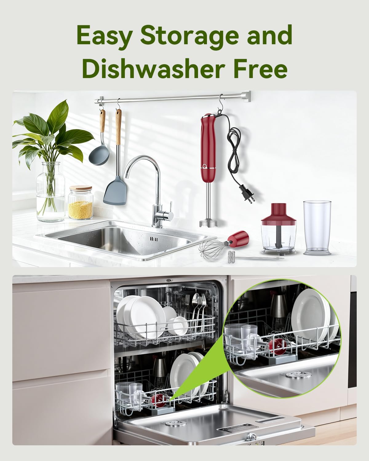EASY TO ASSEMBLE & CLEAN: The snap-on/off detachable attachment design makes it easy to connect and disconnect and a breeze to clean as they all comes off easily than a regular blender. You can just rinse it off after use or wash it in dishwasher(except blender shaft and chopping bowl lid requires hand wash and the water temperature of the dishwasher should be below 75°).