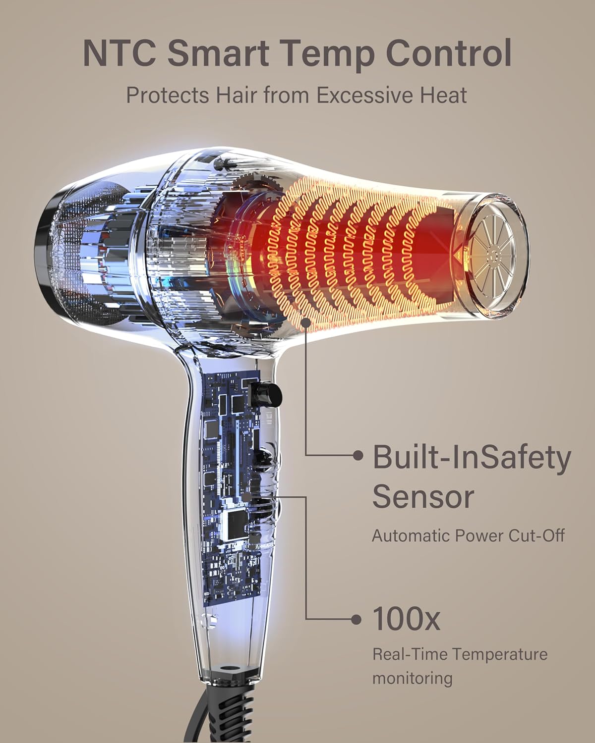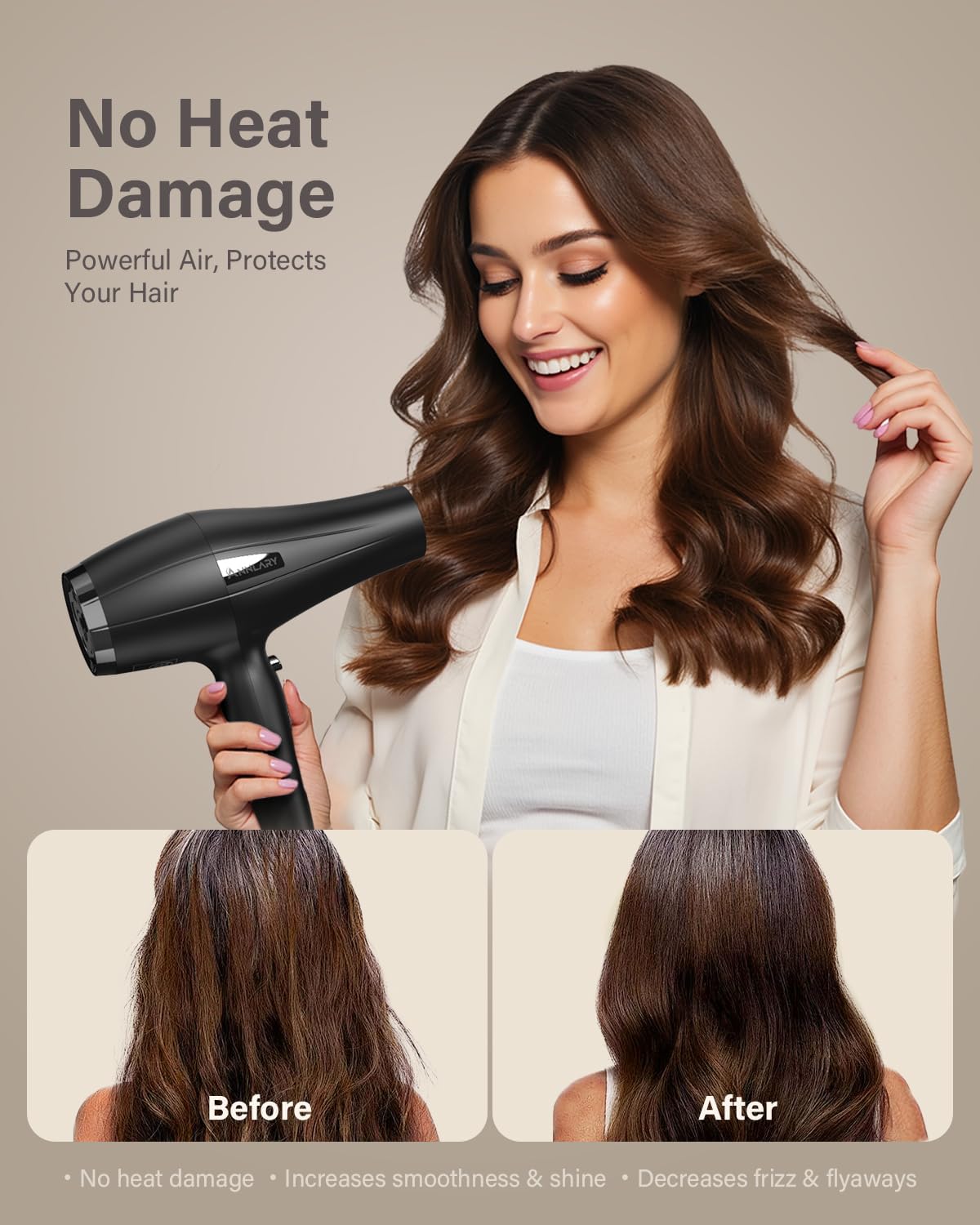 Ionic Care & Smart Heat Protection – Millions of negative ions fight frizz, lock in moisture, and boost shine for healthier-looking hair. NTC smart temperature control prevents excessive heat, protecting both your hair and the dryer while ensuring safe, effective drying.