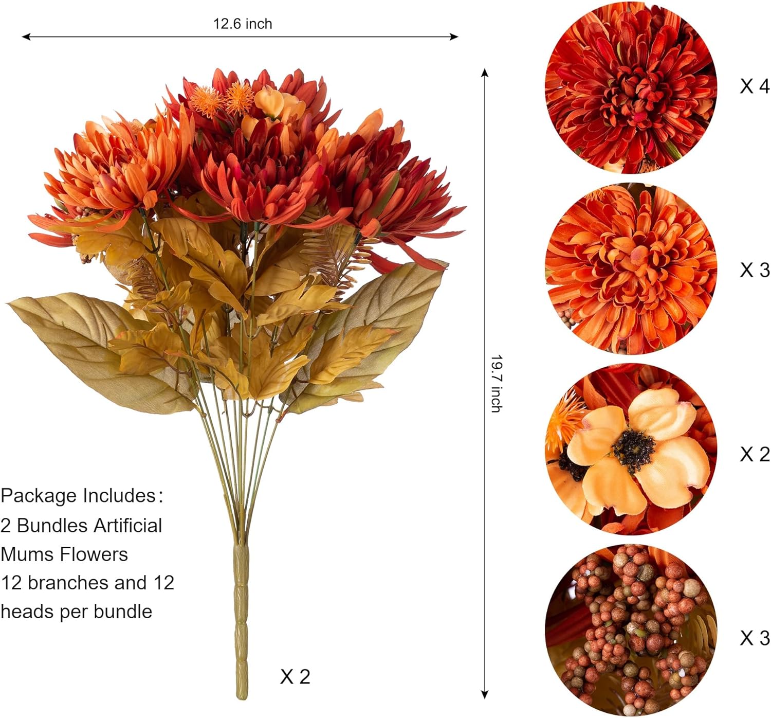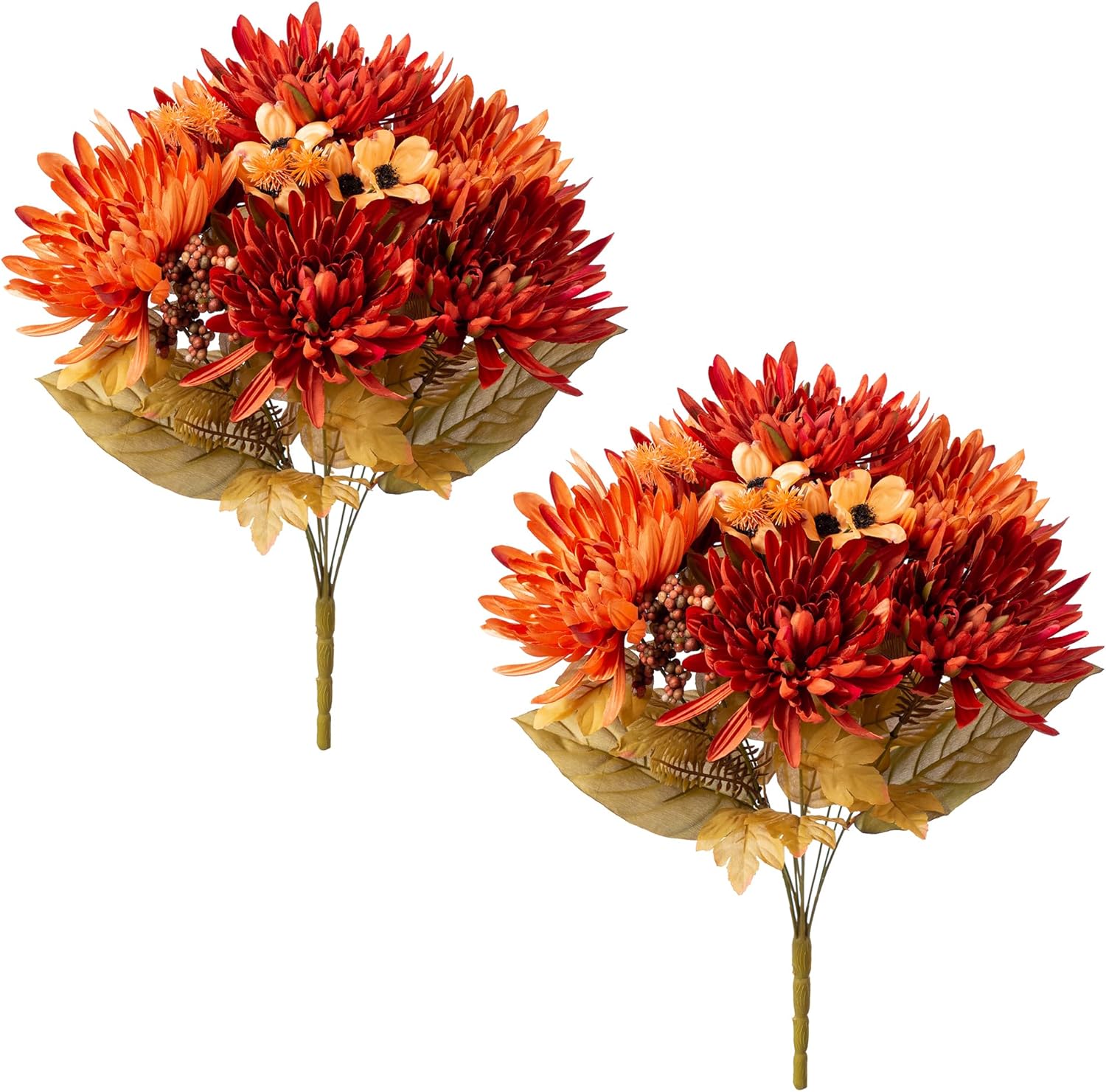 【Size and Quantity】Each Package include 2 bouquets artificial mums for outdoors with 24pcs flowers heads and long stems. Each bouquet flower has 12 pieces flowers, including 7 big Chrysanthemums, 2 medium Flowers and 3 berries. NOT INCLUDED A POT
