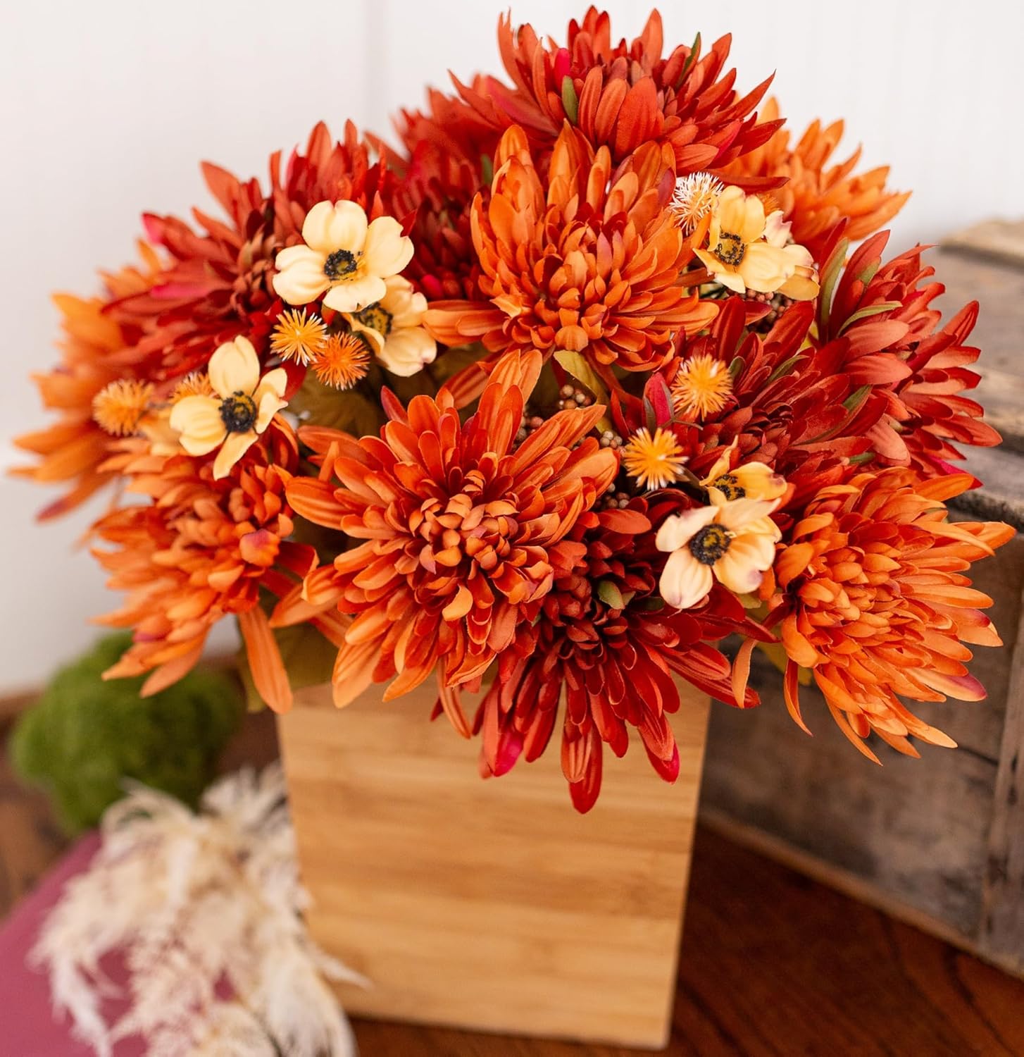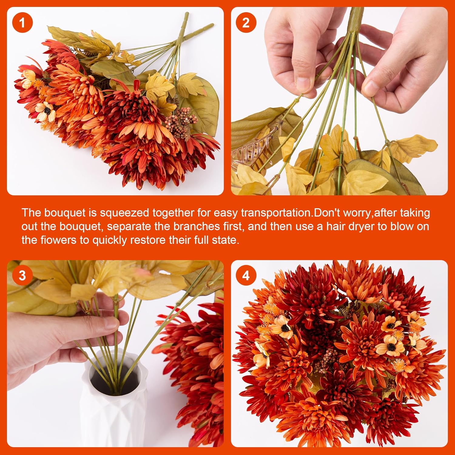 【Attentions】The fake mums flower will be squashed during transportation inevitably. Please let it stand for several hours, and adjust the floral stems leaves and flowers by hand to fluff all the branches. It takes no effort to get the faux flowers looking plump and more vivid.