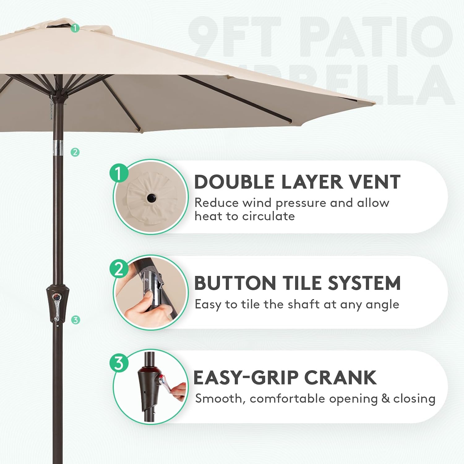MULTIFUNCTIONAL CANOPY: 9FT outdoor umbrella would shades you with at least 4-6 chairs and table, ideal for both residential and commercial location. High-density polyester is WATER & UV RESISTANT. Double-layer Vent enables essential wind and heat to ventilate and makes the umbrella remain stable and grounded