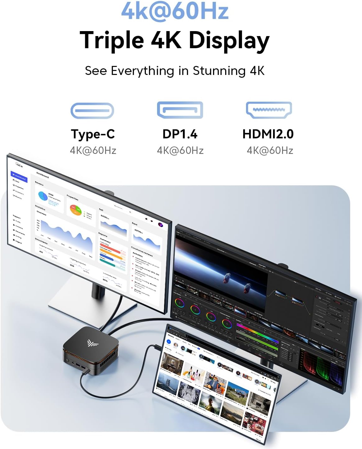 【Triple 4K Display 】Powered by AMD Radeon Graphics,supporting 4K@60Hz displays for stunning image quality and an immersive visual experience. It can connect to 3 display screens simultaneously(1* HDMI + 1*DP 1.4 + 1*Type-C port) —perfect for handling 4k movies, browsers or enjoying immersive entertainment. In addition, it includes two USB 3.2 Gen 2 Type-A ports with transfer speeds up to 10Gbps (up to 21× faster than USB 2.0), ensuring fast and efficient data transfer.