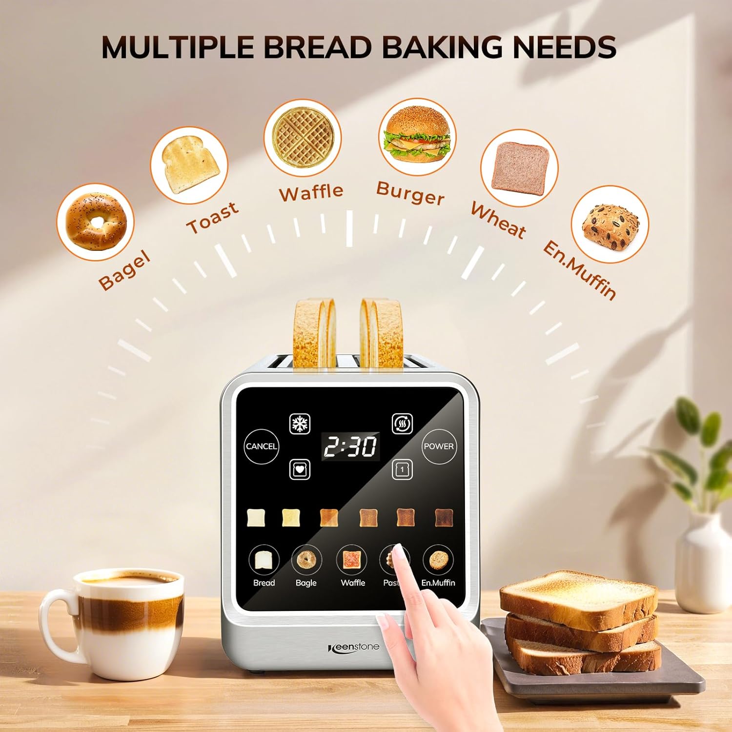 【 TiltControl Touch Screen Interface 】 75° ErgoView Display with 2X larger icons enables standing operation – glide through 6 browning levels/bread types without bending. Ideal for families, this toaster 4 slice combines ergonomic design, user-friendly features, and versatile bread options for a seamless morning routine.