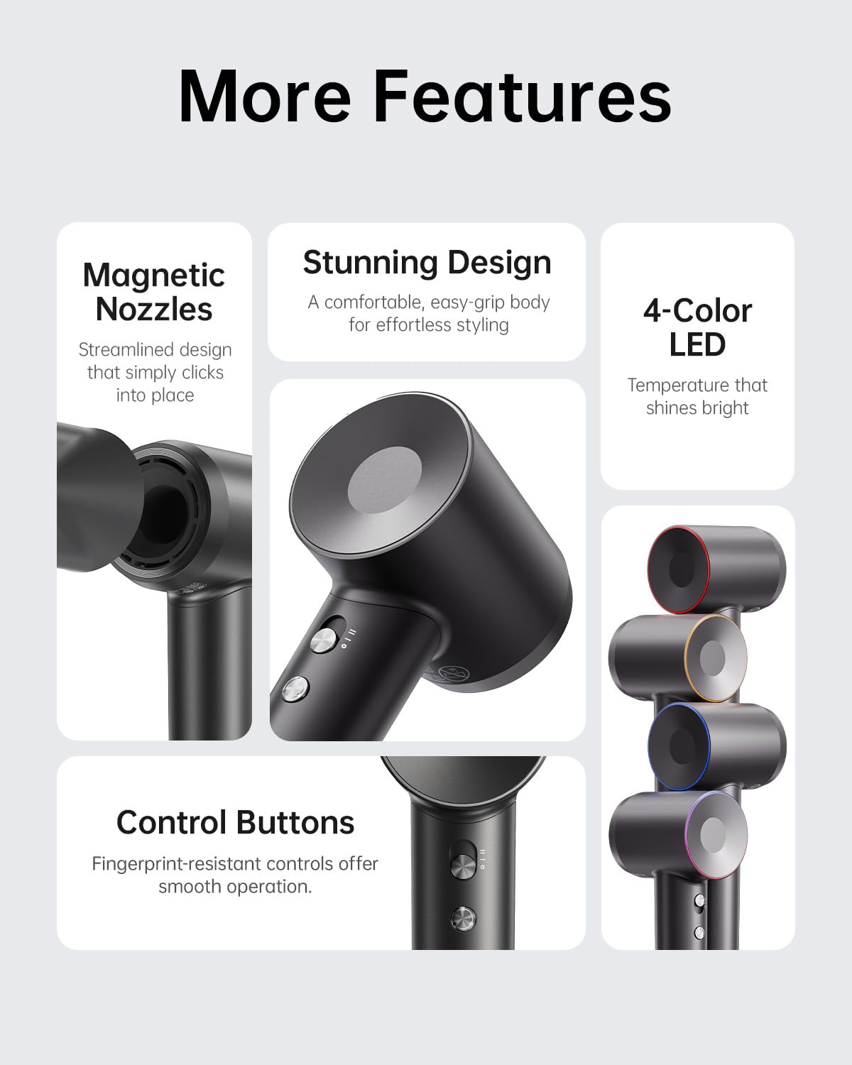 【4 Color LED Ring Light & Low Noise】The 4-color LED ring helps you see the heat. Red indicates 176.0°F hot air, yellow is 122.0°F warm air, and blue is cold air. Press and hold 2s to active temperature circulating mode. The working noise is only 59dB .