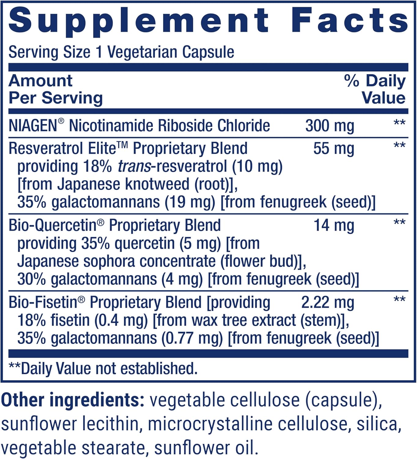 Complementary nutrients – This formula delivers 300 mg of nicotinamide riboside, bioavailable trans-resveratrol, and quercetin and fisetin for complementary health-promoting benefits.