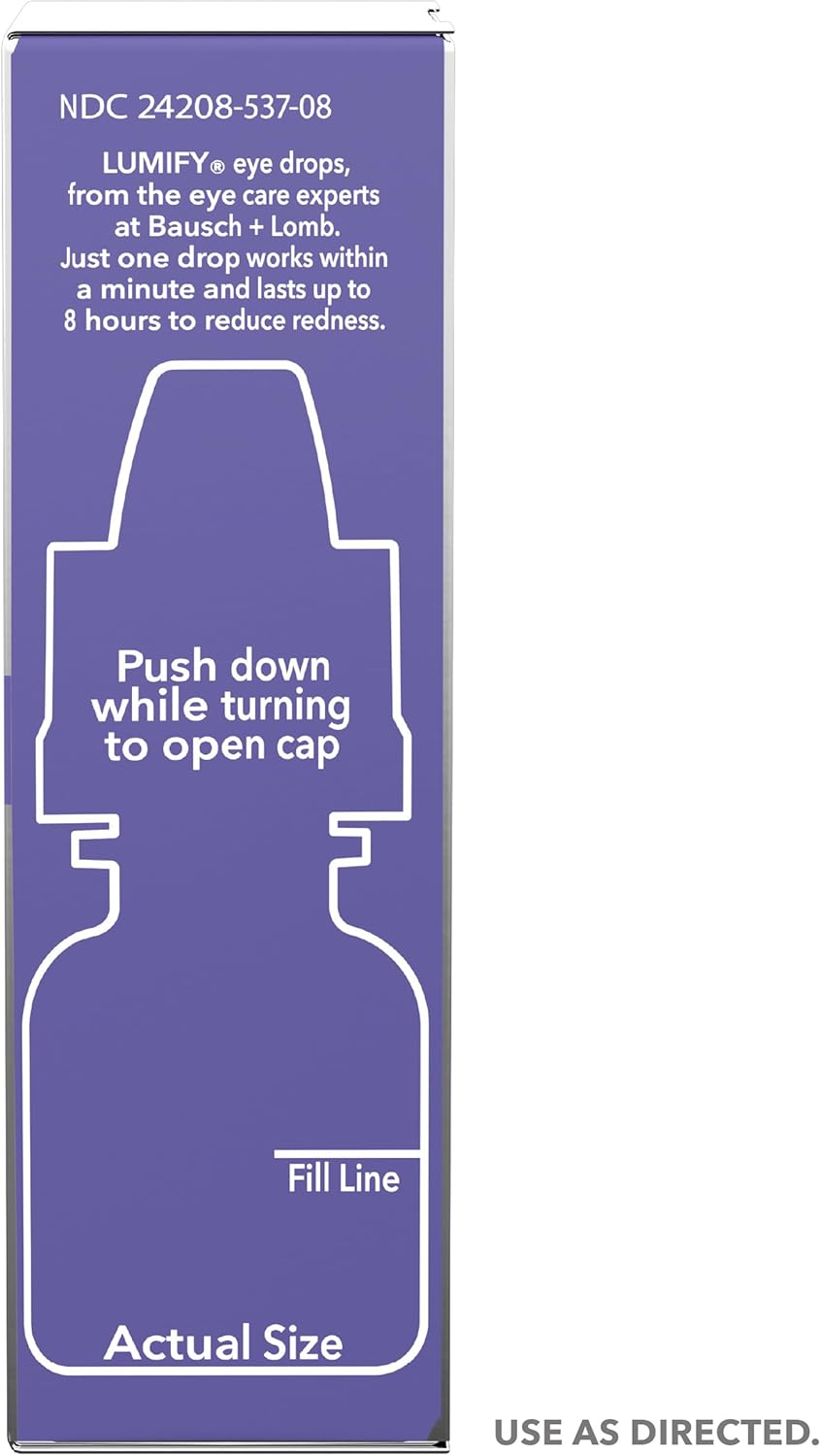 LUMIFY Eye Drops: LUMIFY redness reliever eye drops work in just 1 minute to help red eyes look whiter and brighter, lasting up to 8 hours. They make your eyes feel refreshed and reveal your eyes’ natural radiance. From the eye care experts at Bausch + Lomb.